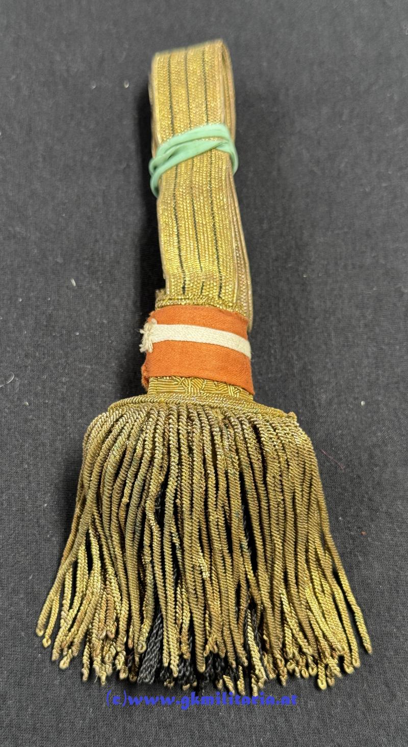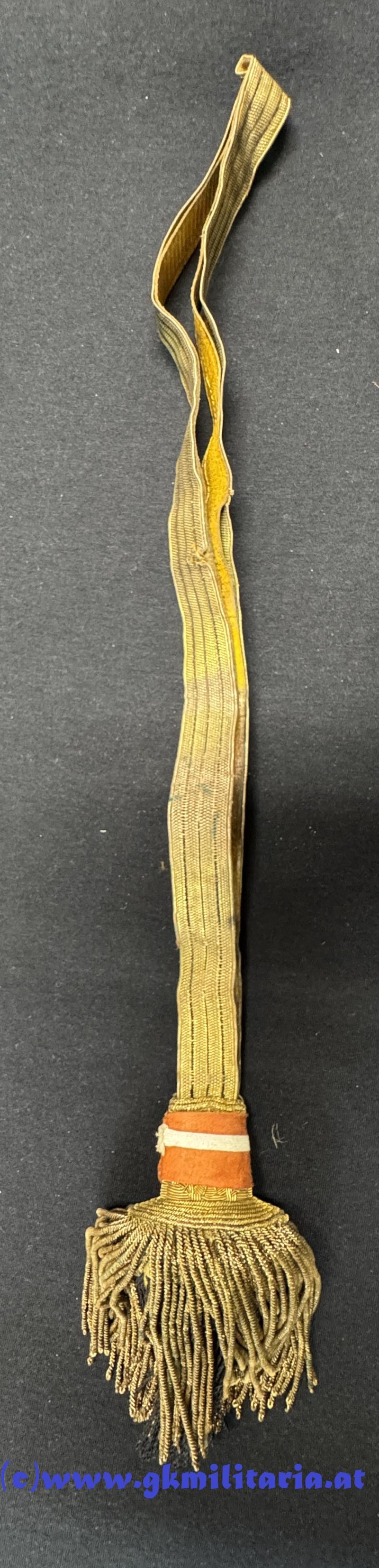 Portepee Säbel für Offiziere "VOLKSWEHR" !! - das Portepee stammt aus der k.u.k. Armee - Doppeladler und allerhöchster Namenszug FJ I. mit rot weiß rotem Stoffstreifen übernäht - Innenseite mit Leder (teilweise Nähte offen) - Band mit 2 kl. Einrissen sonst guter gebrauchter Zustand!