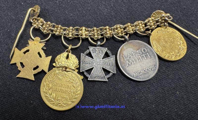 k.u.k. 5-teiliges Frackkettchen für Offiziere! - mit 5 Miniaturen darunter: Militärverdienstkreuz 3. Klasse mit KD und Schwertern - Bronzene Militärverdienstmedaille Kaiser Karl mit Schwertern - Karl Truppenkreuz - Verwundetenmedaille und Bulgarische Weltkriegserinnerungsmedaille - alle Orden in sehr schöner Buntmetallausführung - sehr guter Zustand!