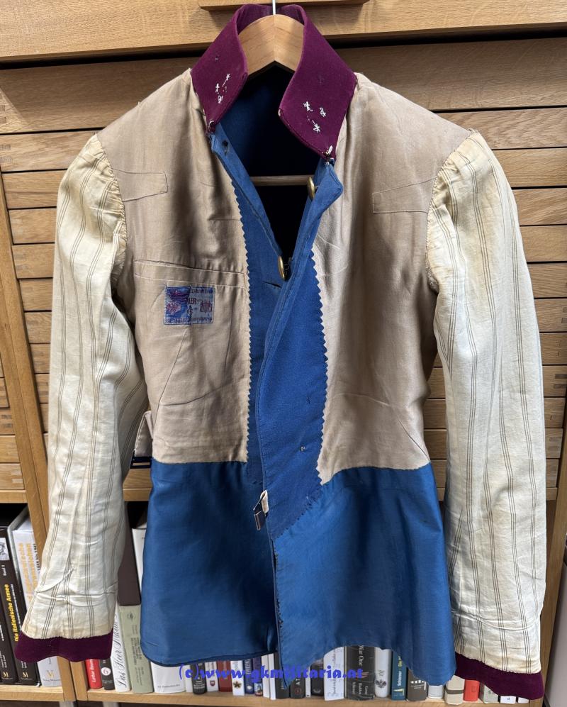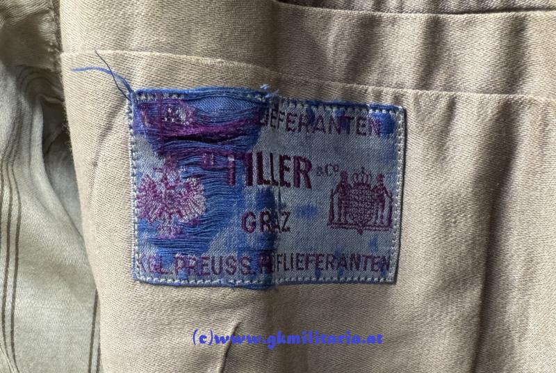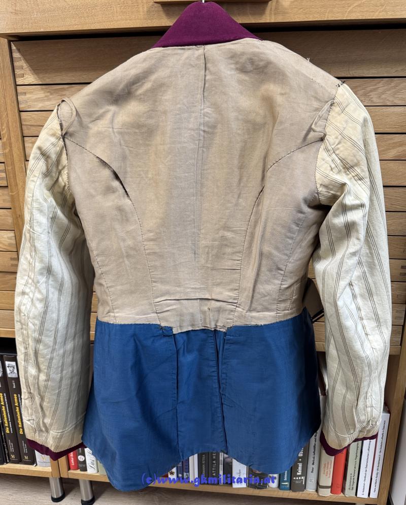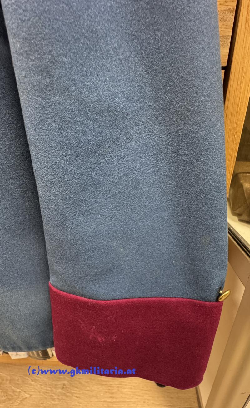 k.u.k. Waffenrock Dragoner Zugsführer - Niederösterreichisches Dragonerregiment Nr. 3 !! - Eigentumsstück - Rock aus lichtblauem Stoff (1 kl. Loch), Stehkragen und Ärmelaufschläge aus dunkelroten Egalisierungstuch - 3 weiße Distinktionssterne - eine Reihe zu 6 glatten vergoldeten Knöpfen - Achselschlinge aus kaisergelber Wolle mit goldenen Knopf - Innenfutter aus beiger und blauer Seide (einige offene Nähte) - Herstelleretikett TILLER, GRAZ - guter gebrauchter Zustand!