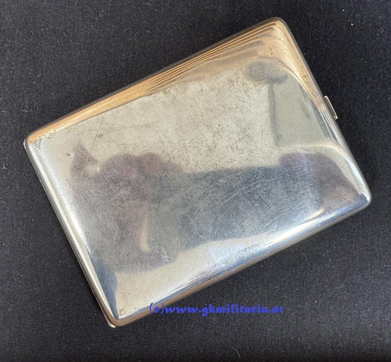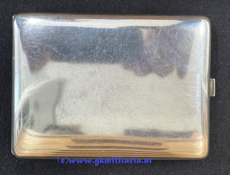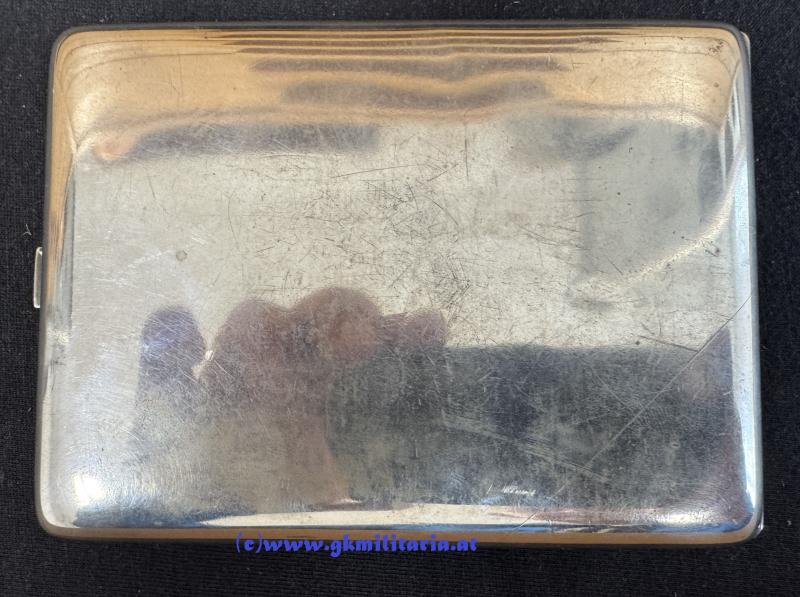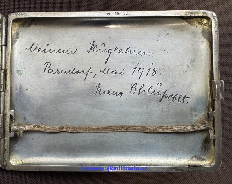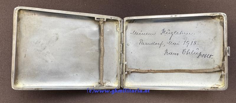 k.u.k. Zigarettentabatiere k.u.k. Luftfahrtruppe - Beobachter u. Feldpilot Oblt. Chlup Franz ! Flek 7 Parndorf!! - Silber alt punziert 800 u. Meistermarke WR - 128 Gramm Silber - mit Widmung: "Meinem Fluglehrer - Parndorf, Mai 1918 Franz Chlup Oblt." - Oblt. Chlup war vorerst Beobachter bei der Fliegerkompanie 49 und machte dann ab 18.5.1918 seine Feldpilotenausbildung bei der Fliegerersatzkompanie 7 in Parndorf/Burgenland! - sehr guter gebrauchter Zustand! - Selten!!
