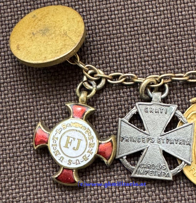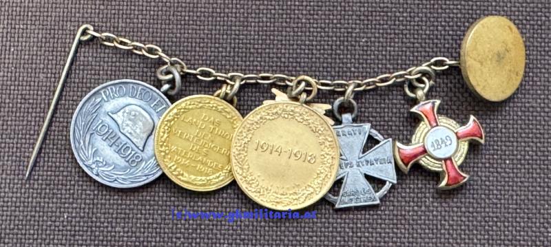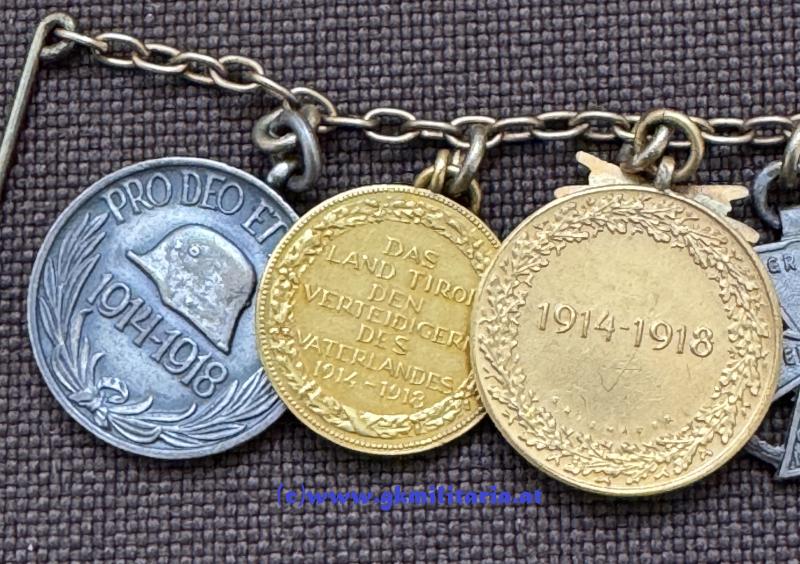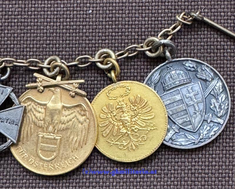 k.u.k. 5-teiliges Frackkettchen!! - bestehend aus: Goldenes Verdienstkreuz vergoldet und beidseitig emailliert - Karl Truppenkreuz - Österr. Weltkriegserinnerungsmedaille mit Schwertern - Tiroler Weltkriegserinnerungsmedaille 1914-1918 - Ungarische Weltkriegserinnerungsmedaille - sehr guter Zustand!