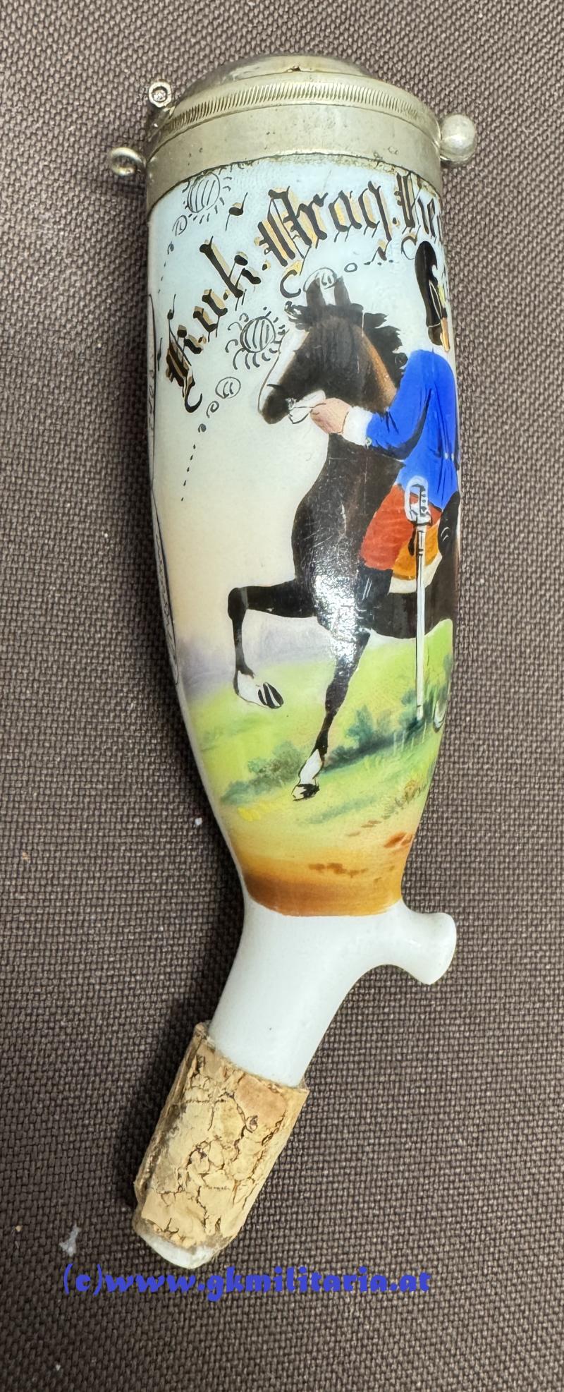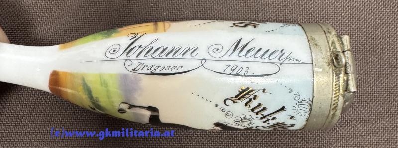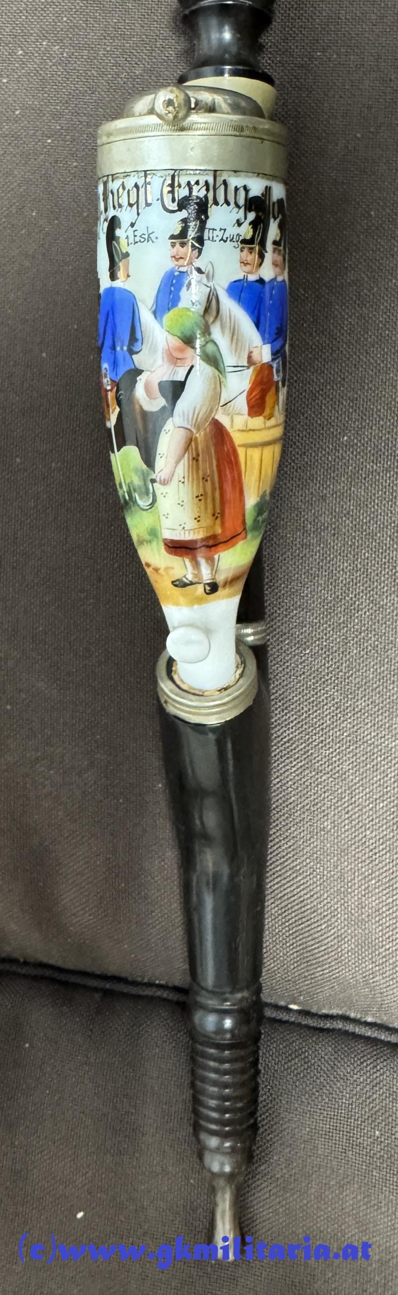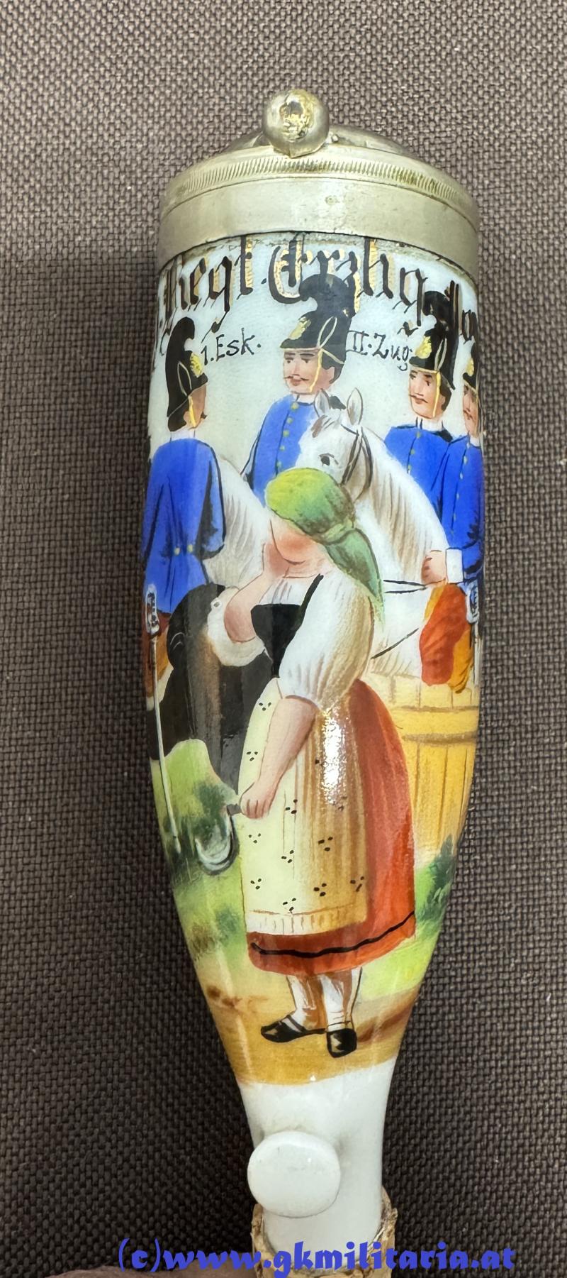 k.u.k. Reservistenpfeife Dragonerregiment Erzherzog Joseph Nr. 15 !! - Pfeifenkopf aus Porzellan mit Namen Johann Meurer Dragoner 1903 - mit Deckel - sehr langer Pfeifenstiel mit aufgelegten Doppeladler - Länge Stiel ca. 80cm - sehr guter Zustand!