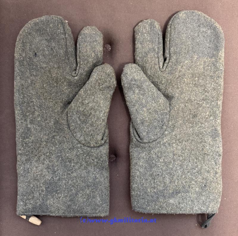 k.u.k. Kälteschutz-Fäustlinge mit Abzug-Zeigefinger! - aus grobem Wollstoff gefertigt - Schlaufe mit Olive aus Holz zum Zusammenbinden - leichte Lager- und Altersspuren - einige kleinere Löcher - guter gebrauchter Zustand! - selten!