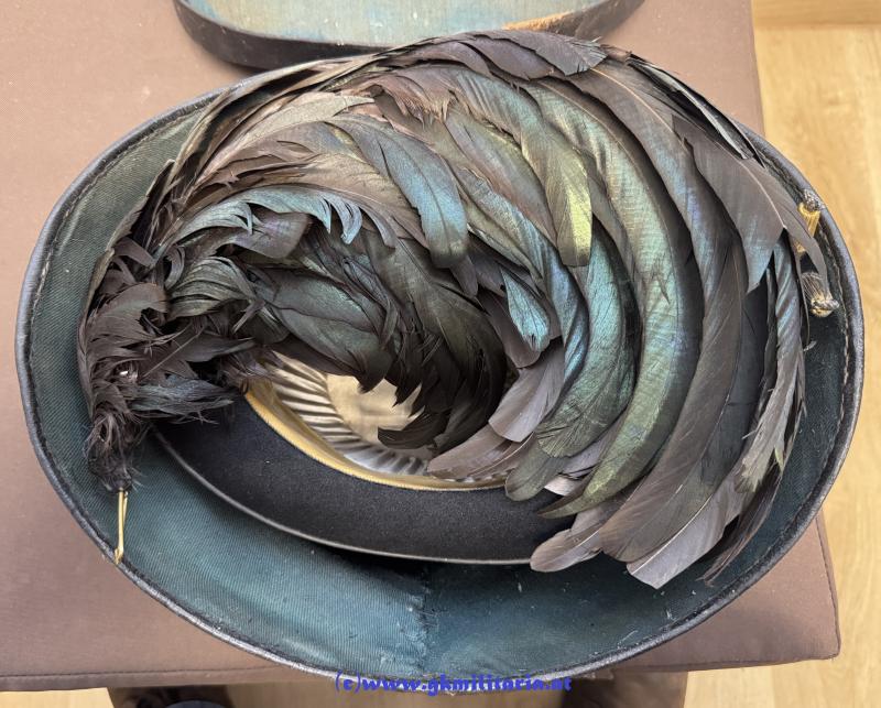 k.u.k. Jägerhut für Offiziere des Landwehr-Infanterie-Regimentes "Stryi" Nr. 33 mit Hahnenfederbusch - schwarzer steifer Filzkorpus und Jägerhorn mit Nr. 33 für L.I.R. 33 - goldene schwarz durchwirkte Hutkordel für Offiziere (gedunkelt) - eingesteckter originaler Hahnenfederbusch - feines braunes Stirnleder und Innenfutter aus weißer Seide - Herstelleretikett: "TILLER; Wien" - beide Halterungen für den Sturmriemen vorhanden - Sturmriemen fehlt - Größe 55 1/2 - Jägerhut im sehr guten ZUSTAND! - dazu der originale privat besorgte Koffer für den Jägerhut der Firma Rachler, Wien - dazu noch ein Kragenschoner - sehr schöner Jägerhut des L.I.R.33 im vollständigen und sehr guten gebrauchtem Zustand!