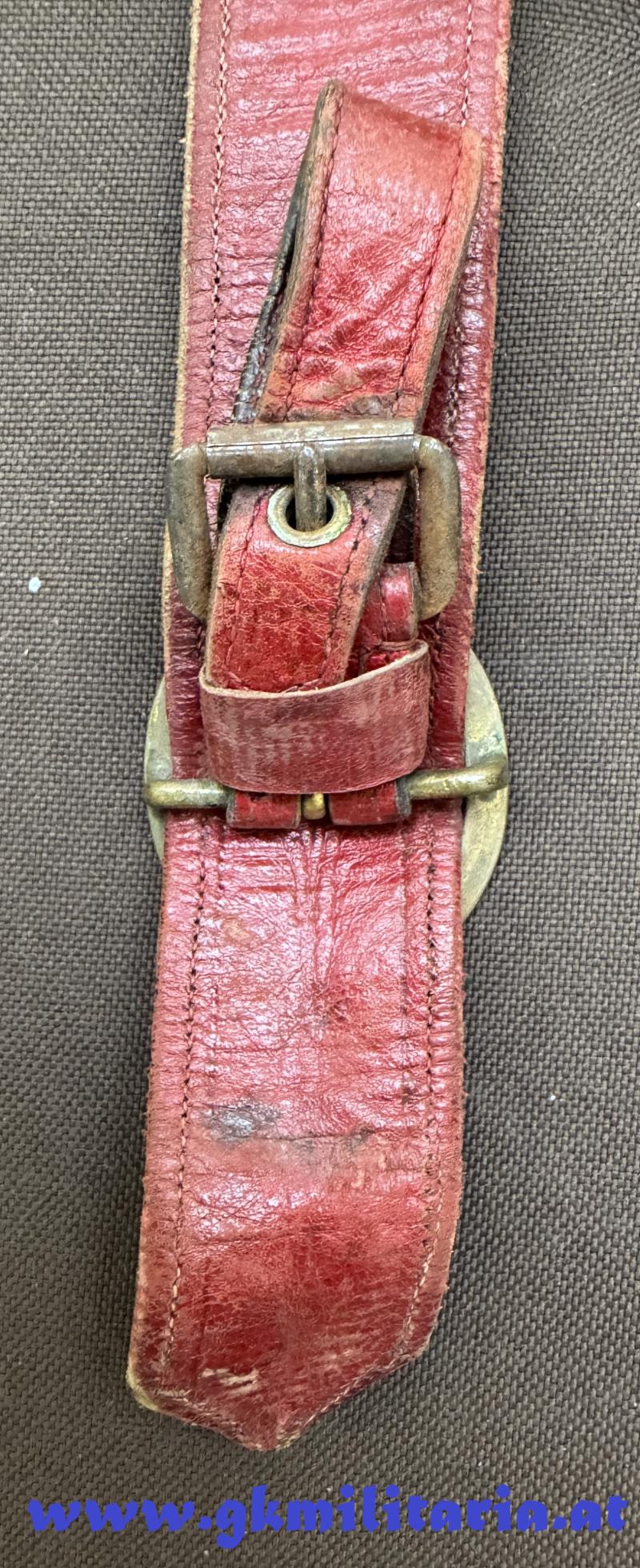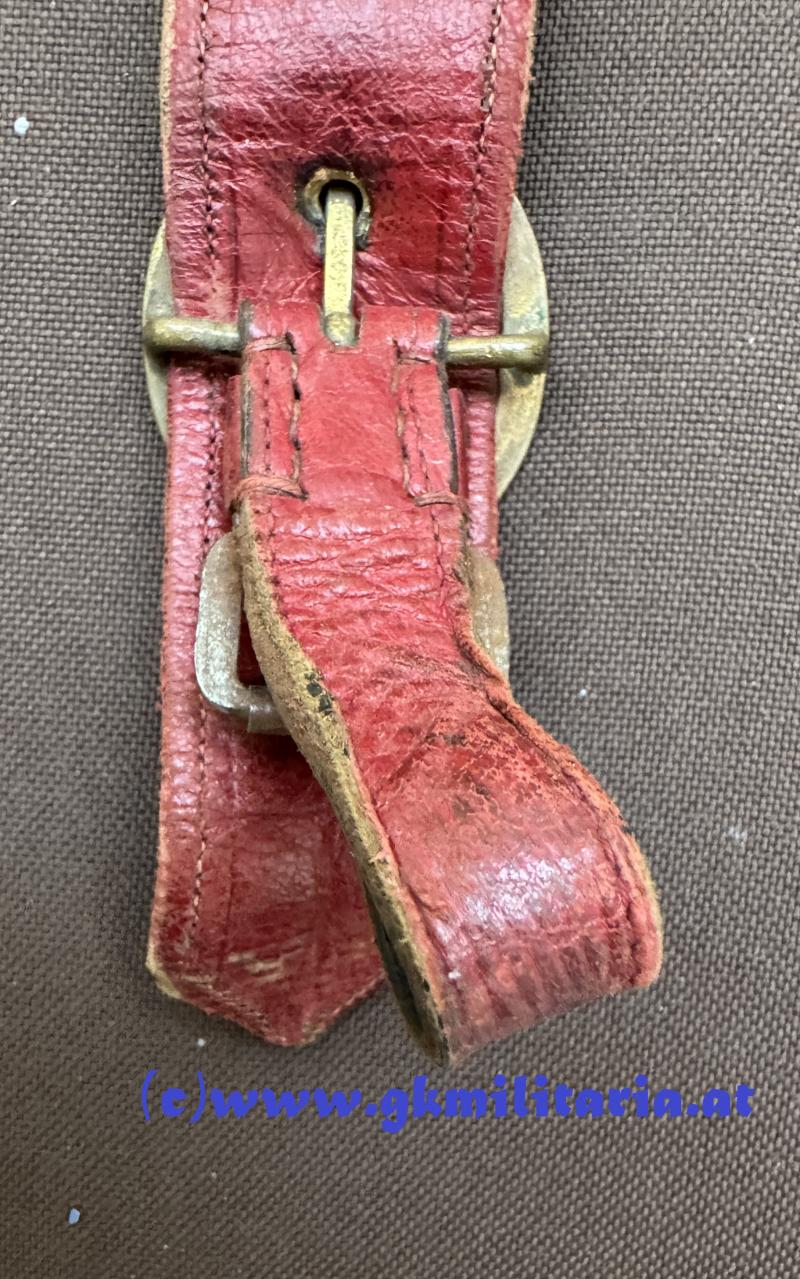 k.u.k. Säbelgehänge für Offiziere!! - die 2 Hänger für den Säbel mit Offiziersborte aus Goldgespinst und schwarzem Durchzug und auf Rückseite mit rotem Safianleder belegt - dazu Kettensicherung für den Säbel - Gürtel aus braunem Leder (gekürzt und neue Löcher) - sonst guter gebrauchter Zustand!