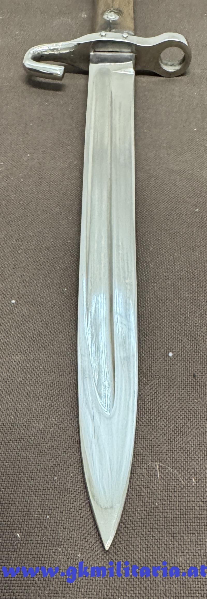 k.u.k. Bajonett M95 für Offiziere!! - Messerbajonett M1895 - Offizier - vernickelt - Eigentumsstück -Bajonett komplett vernickelt - blanke Klinge ohne Hersteller und ohne Armeeabnahme - mit Nieten 2-fach vernietete sehr schöne Holzgriffschalen - flache Parierstange mit Portepeebügel - Drücker gängig - original vernickelte Scheide - brauner Koppelschuh in der Ausführung für Offiziere in sehr guter Erhaltung - sehr schönes Offiziersbajonett im ungereinigten und unberührten Top-Zustand!