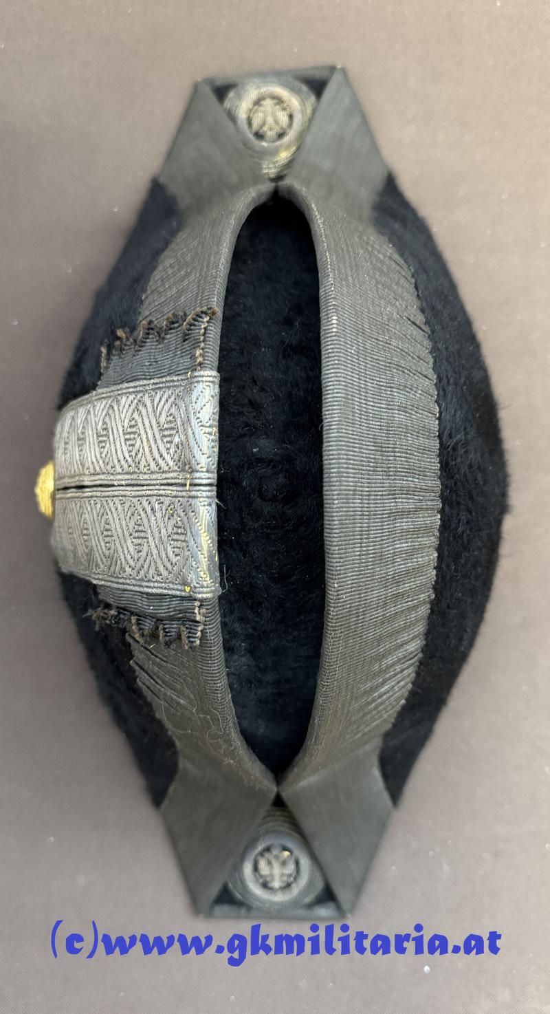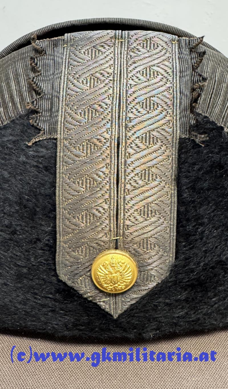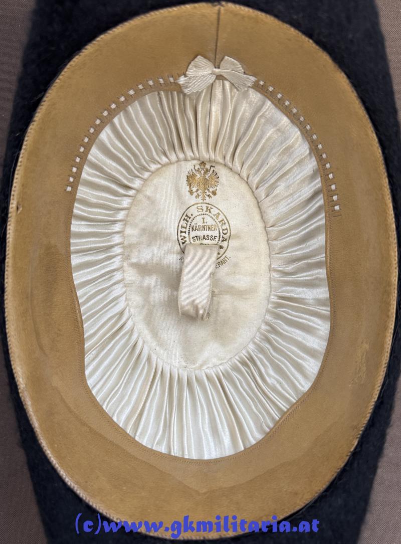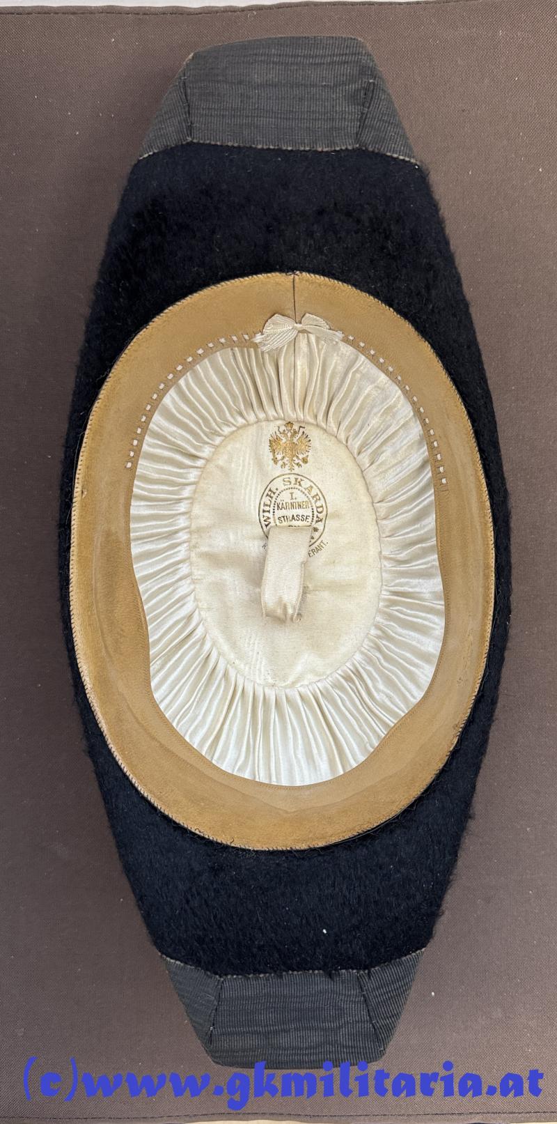 Zweispitz k.u.k. Staatsbeamter - Stulphut!! - zur Galauniform eines Beamten - Fertigung wohl um 1910 - aus schwarzem, hochflorigem Seidenfilz - sehr formstabil - Krempe mit schwarzem , gewässertem Seidenband eingefasst - in den Hutspitzen jeweils eine goldgestickte Rosette mit dem Doppeladler - Hutschlinge aus gedunkelter goldener Beamtenborte - unterlegt mit einer eckigen Kokarde aus gewässertem Seidenband, in der Spitze ein vergoldeter Knopf mit Doppeladler - weißes, elegant plissiertes Seidenfutter - darauf der goldgedruckte Herstellerverweis 'k. u. k. Hoflieferant Wilhelm SKARDA, WIEN', hellbraunes Schweißleder, kein Größenetikett -Kinnriemenlasche, Kinnriemen fehlt - sehr guter Zustand!