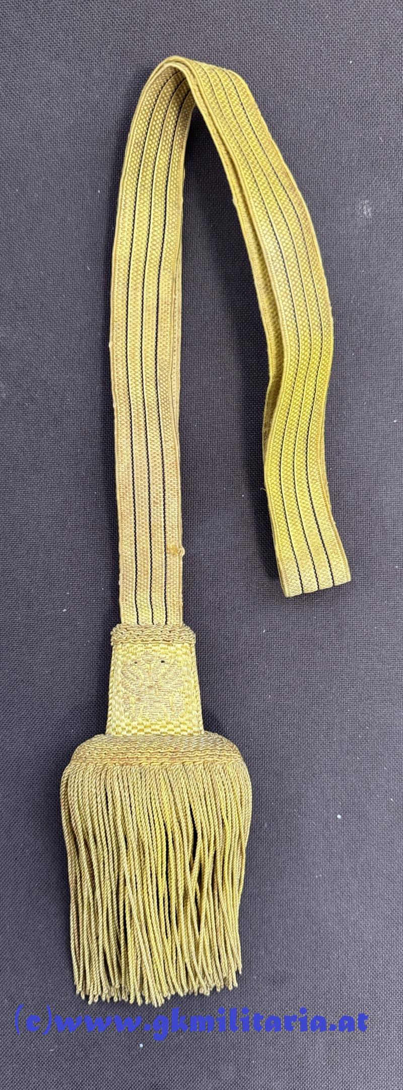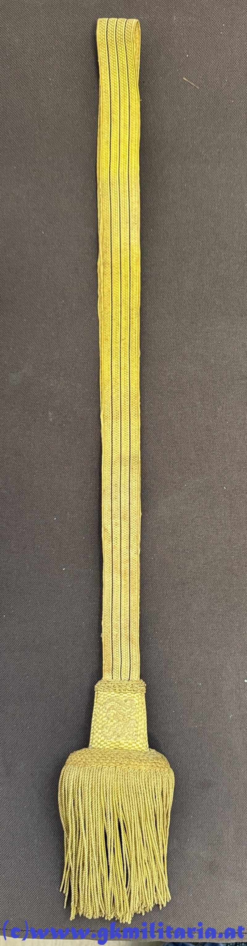 k.u.k. Portepee Säbel Kaiser Franz Joseph I. ! - für höhere Unteroffiziere - Variante mit langen Fransen - Band mit 3 schwarzen Durchzügen - auf der Vorderseite allerhöchster Namenszug "FJ I." für Kaiser Franz Joseph I. und auf der Rückseite "Doppeladler"- Fransen aus kaisergelber und schwarzer Wolle - sehr guter gebrauchter Zustand!
