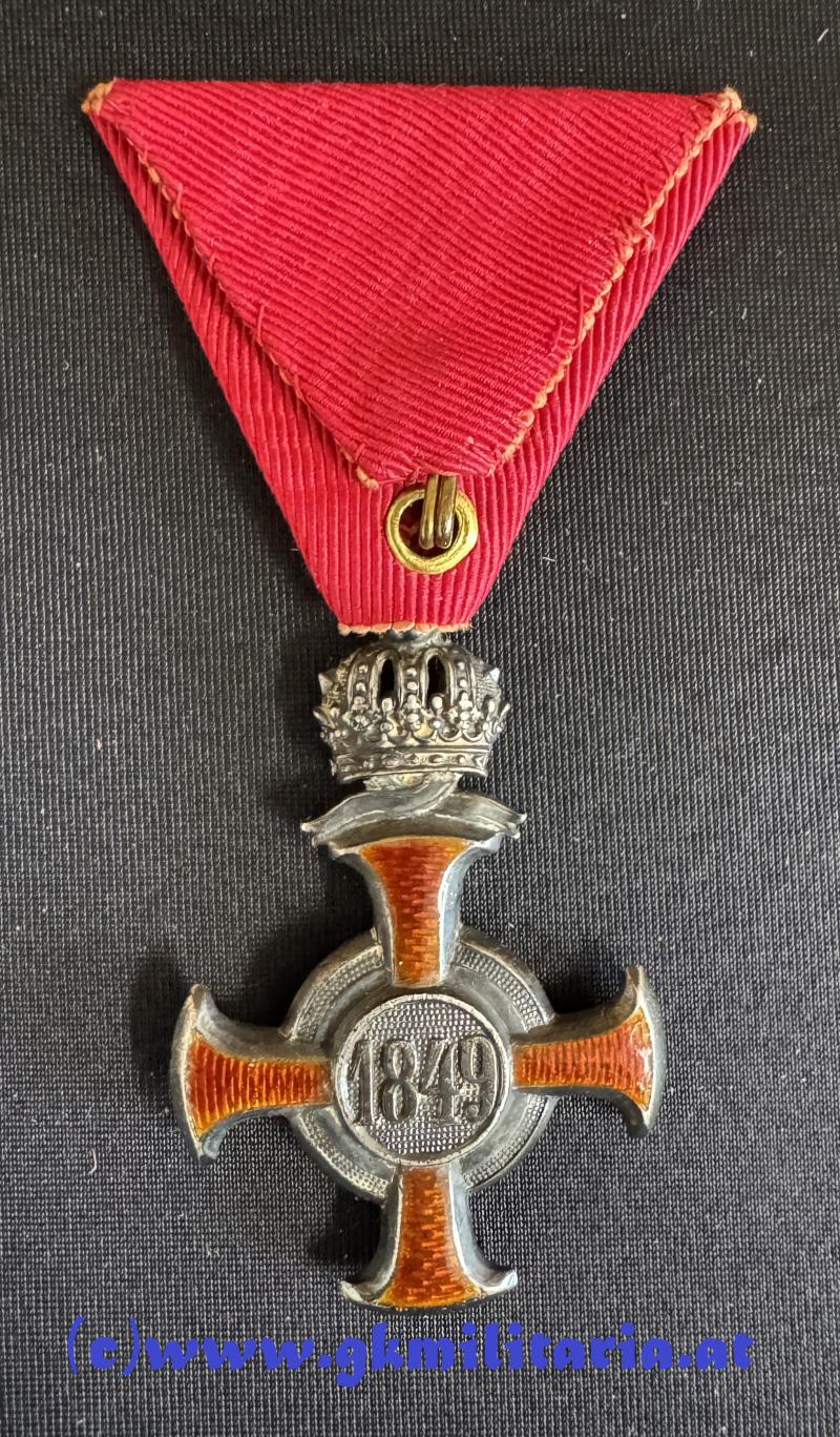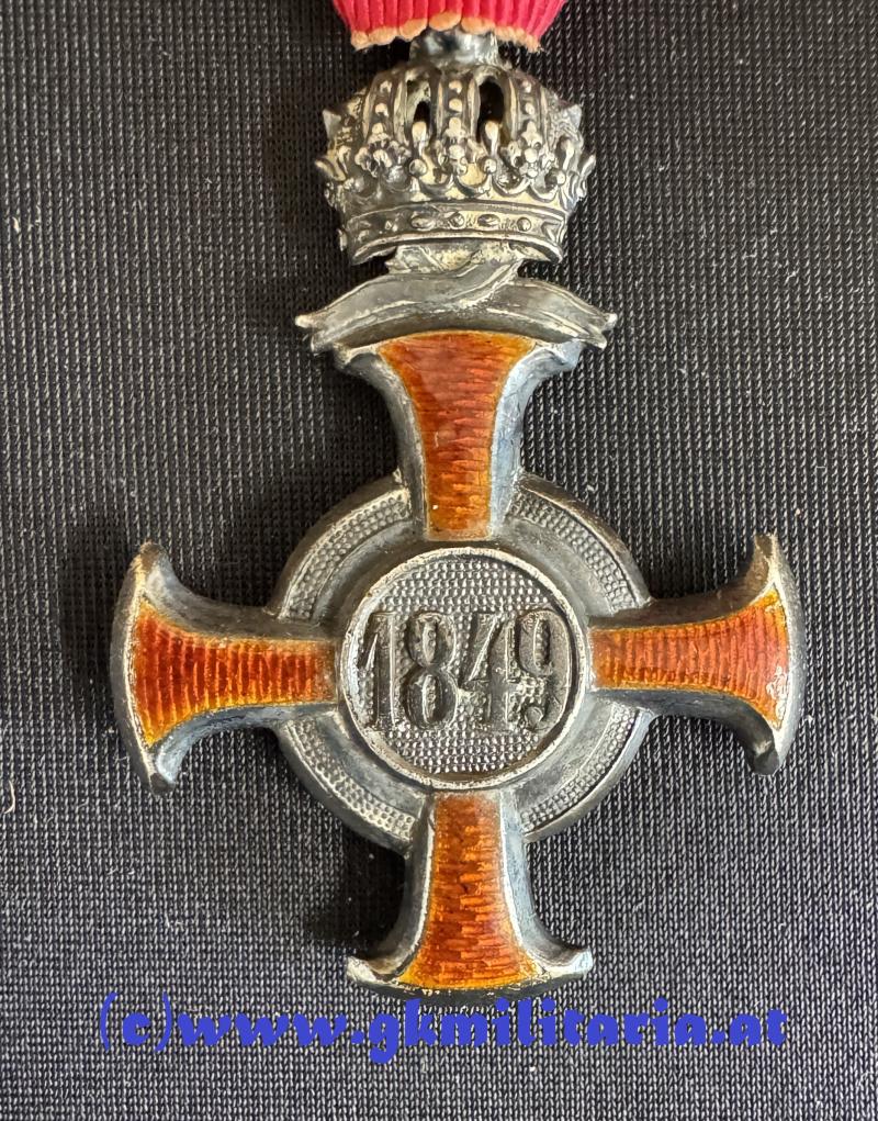 k.u.k. Silbernes Verdienstkreuz mit Krone - BRAUN - um 1860!! - Silber nicht punziert und Herstellerpunze Braun, Wien im Ring - sehr frühes Stück vor 1867 - Variante mit kleiner Krone wie es bei den Stücken der ersten Fertigungsserie vom Hersteller Braun typisch war - auf Rückseite rechter und linker Kreuzarm mit oberflächlichen Chip Vorderseite kleiner oberflächlicher Chip am rechten Kreuzarm - am originalem roten zivilen Band - sonst für das Alter von 160 Jahren sehr guter gebrauchter Zustand!