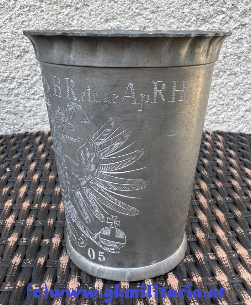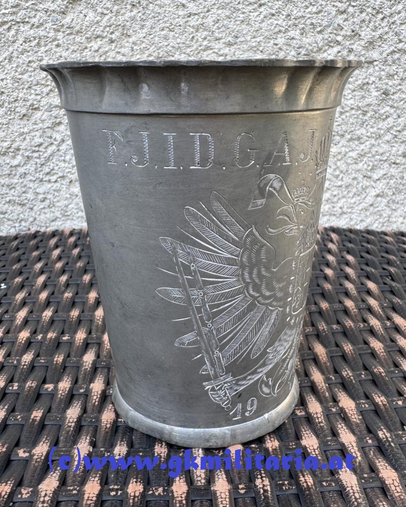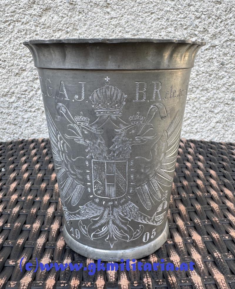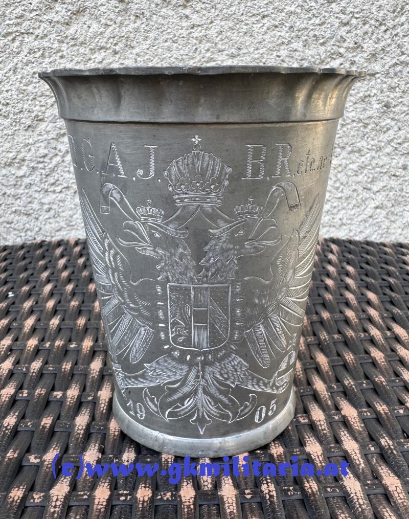 k.u.k. Fußwaschungsbecher Kaiser Franz Joseph I. - 1905!! - Zinnbecher - mit Doppeladler und Umschrift F.J.I.D.G.A.J. - B.R.etc. ac. Ap. R.H. - 1905 - 14cm Höhe - guter gebrauchter Zustand!