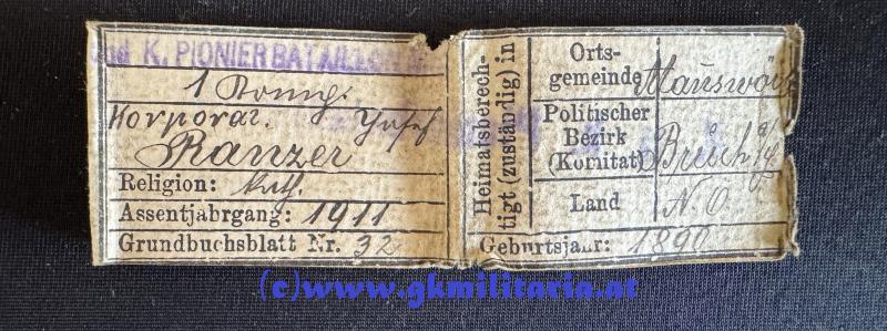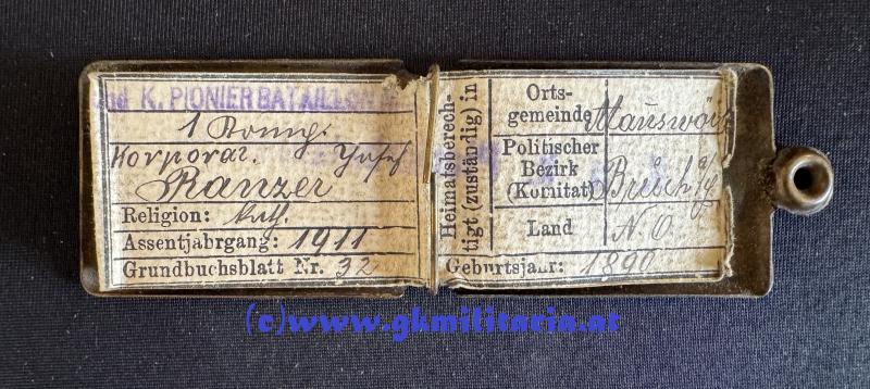 k.u.k. Legitimationskapsel Korporal Josef Ranzer k.u.k. Pionier-Bataillon Nr. 2 !!