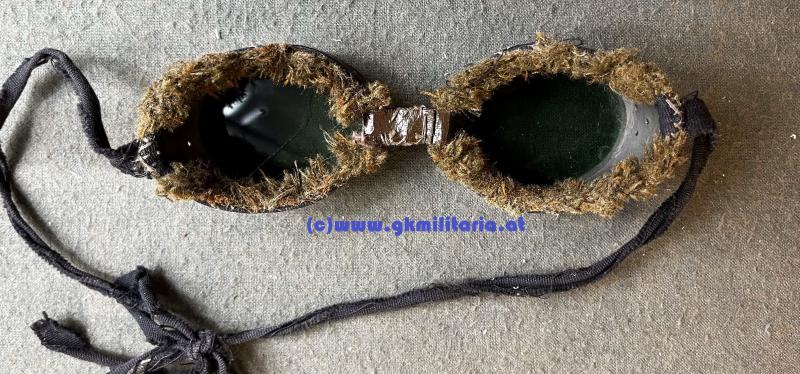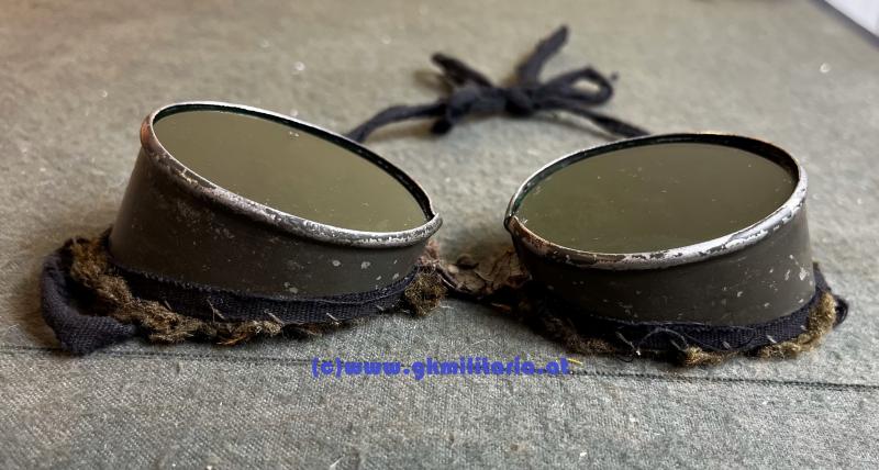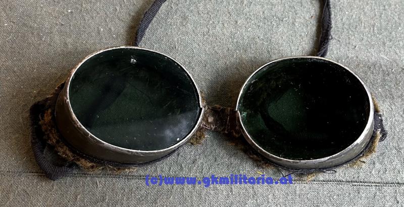 Schneebrille für Gebirgstruppe der k.u.k. Armee - feldgrau lackiertes Eisenblech mit eingesetzten grünen Gläsern - Rahmen mit weichem Kunstfell - Mittelriemen aus Leder - schwarze Leinenbänder zur Befestigung -