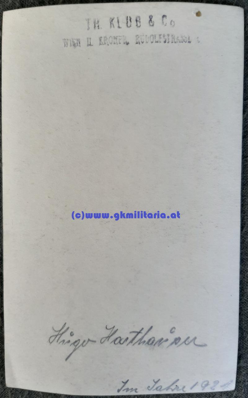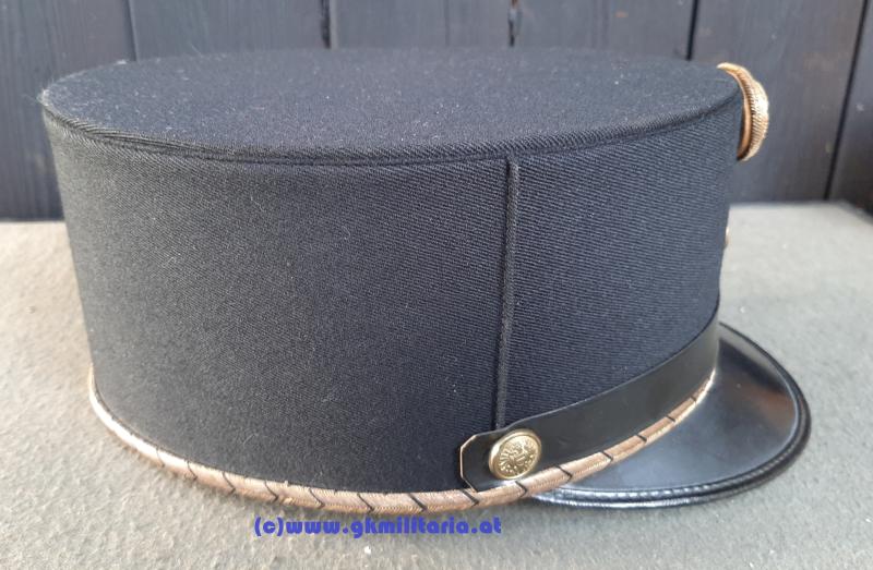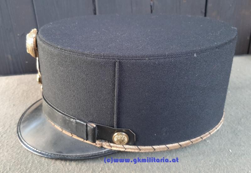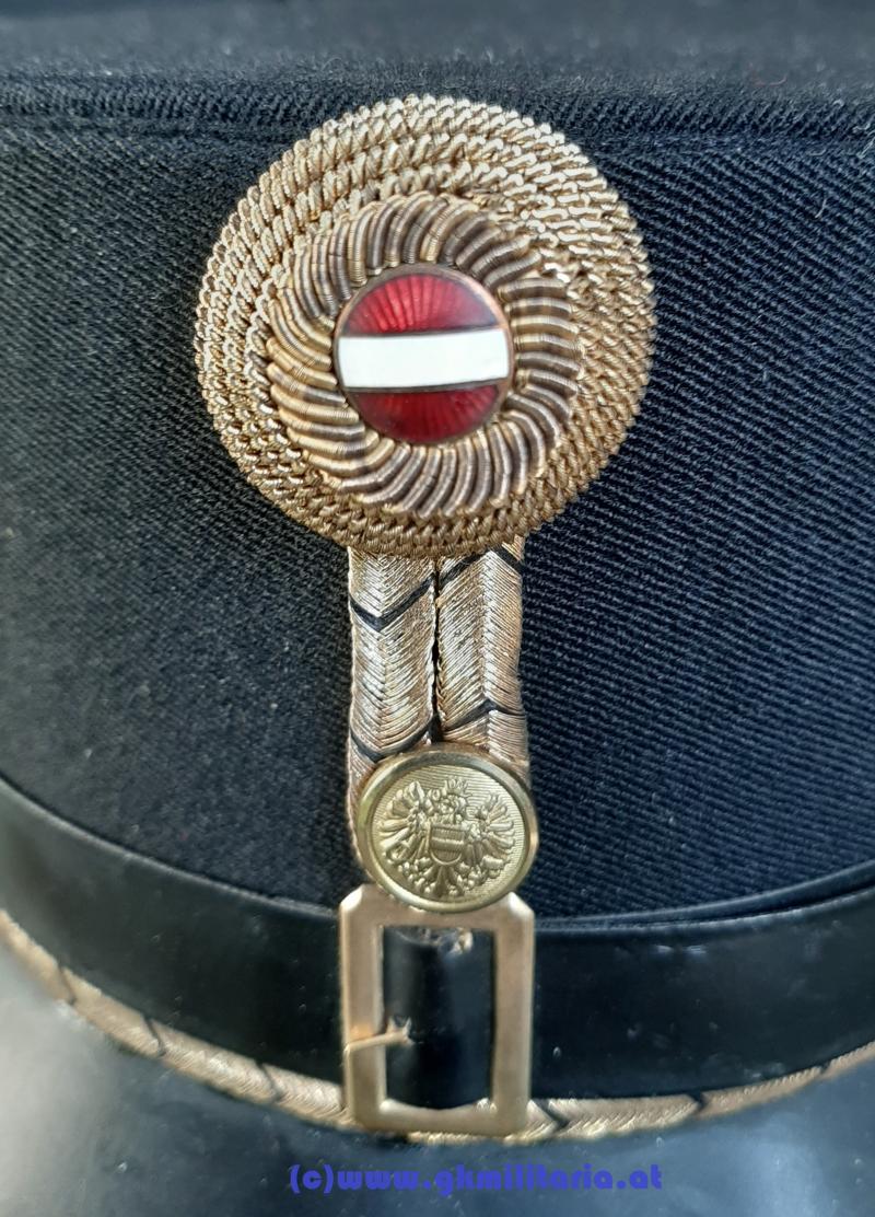 Österreich 1. Republik - schwarze steife Kappe für Beamte m. Trägerfoto!! - Korpus mit schwarzem Wollstoff überzogen - umlaufend goldene schwarz durchwirkte Kappenschnur für Offiziere - in der Mitte vorne rot-weiss-rot emaillierte Kappenkokarde für Offiziere - goldene Knöpfe mit einköpfigen Bundesadler der 1. Republik (1921-1933) - Sturmriemen aus schwarzem Kunstleder - schwarzer Kunststoffschirm sehr schönes hellbraunes Stirnleder - schwarzes Seideninnenfutter mit Herstelleretikett Dürrbeck Wien (leicht verblasst und Aufrauhungen) - dazu Trägerfoto vom Beamten Hugo Harthauser 1921 Fotograf: Th. Klug & Co Wien II. Bezirk - frühe Beamtenkappe der 1. Republik mit Trägerfoto im sehr gutem Zustand!!