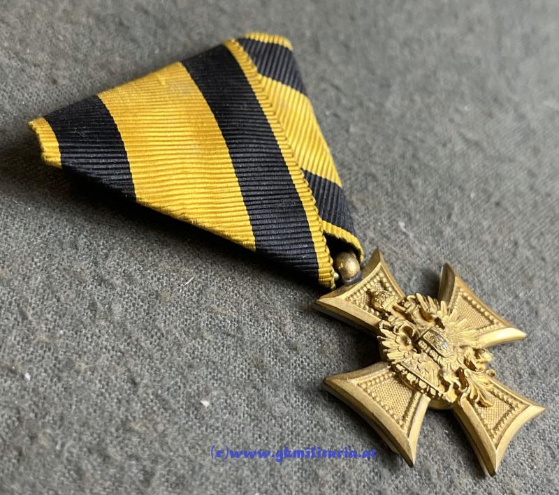 k.u.k. Militärdienstzeichen f. Offiziere 2. Klasse für 50 Jahre!! - RAR! - Variante Perlmutt! - Kreuz vergoldet - Adler vergoldet für 50 Jahre Dienstzeit - zweiteilig gefertigt - Variante Rückseite Perlmuttauflage (Kreuzarm 3 Uhr fehlt kl. Stück) - am originalem Band - sonst sehr guter Zustand!