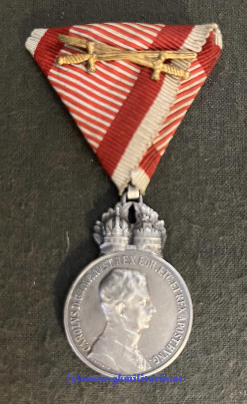 k.u.k. Silberne Militärverdienstmedaille Kaiser Karl I. - Silber! - MINT! - im Rand Silber "A" Punze Kontrollamtspunze HMA Wien - Stempelschneider KAUTSCH - am originalem Band mit Schwertern - Zustand MINT!