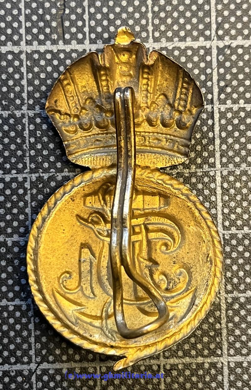 k.u.k. Kriegsmarine KappenkokardeFJ I. für Unteroffiziere! - vergoldet und schwarz lackiert - originale Trageklammer auf der Rückseite - oben fehlt ein Stück des Kreuzes - sonst sehr guter gebrauchter Zustand!