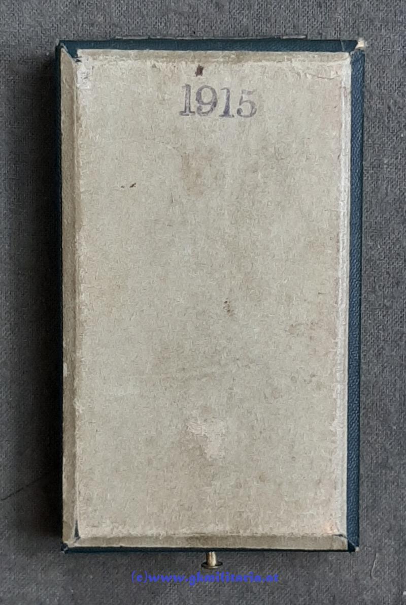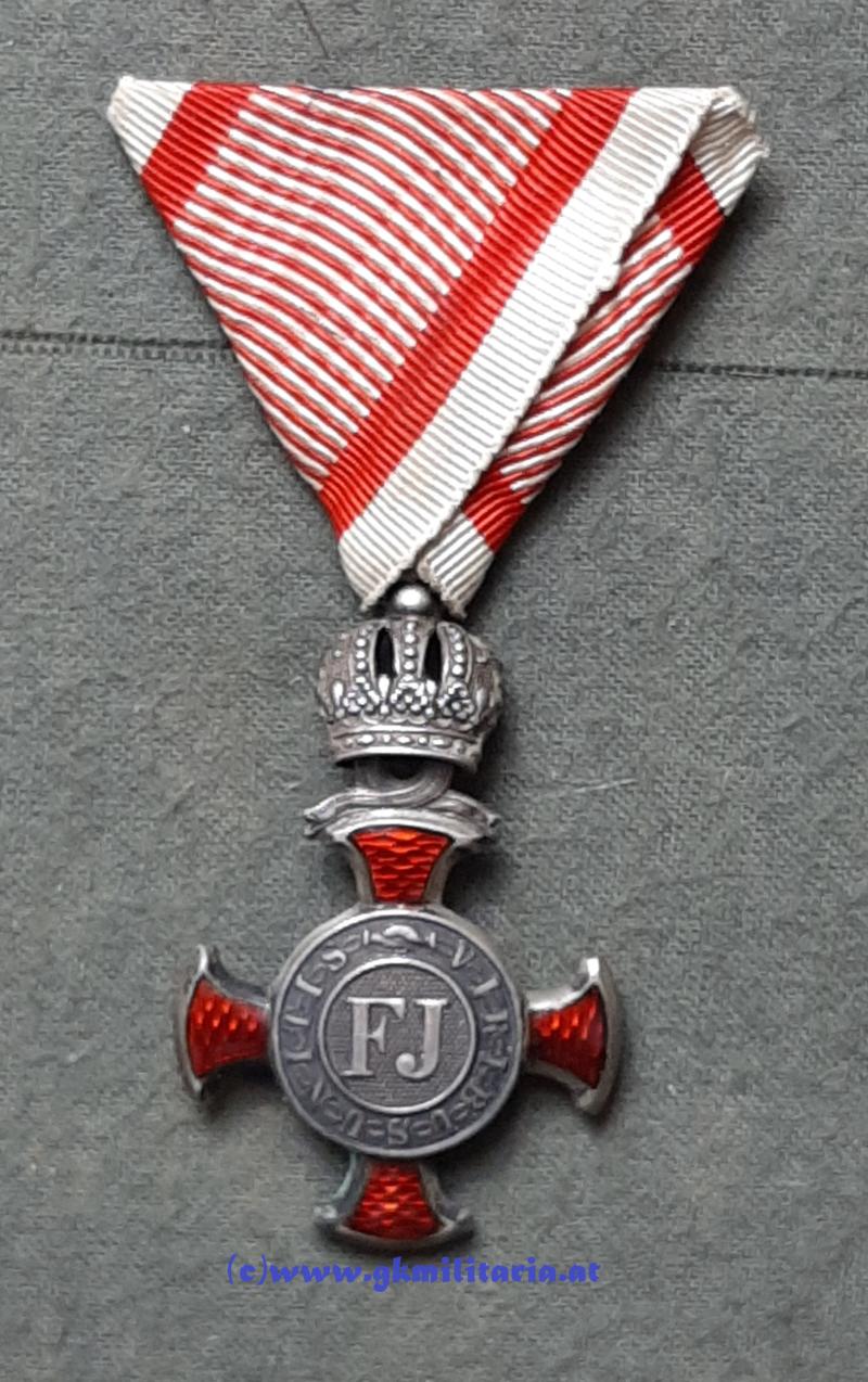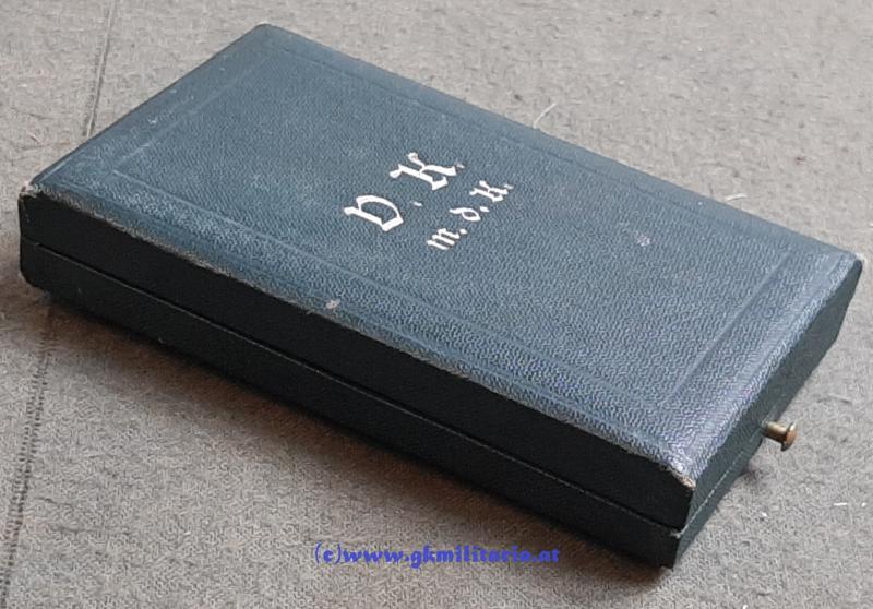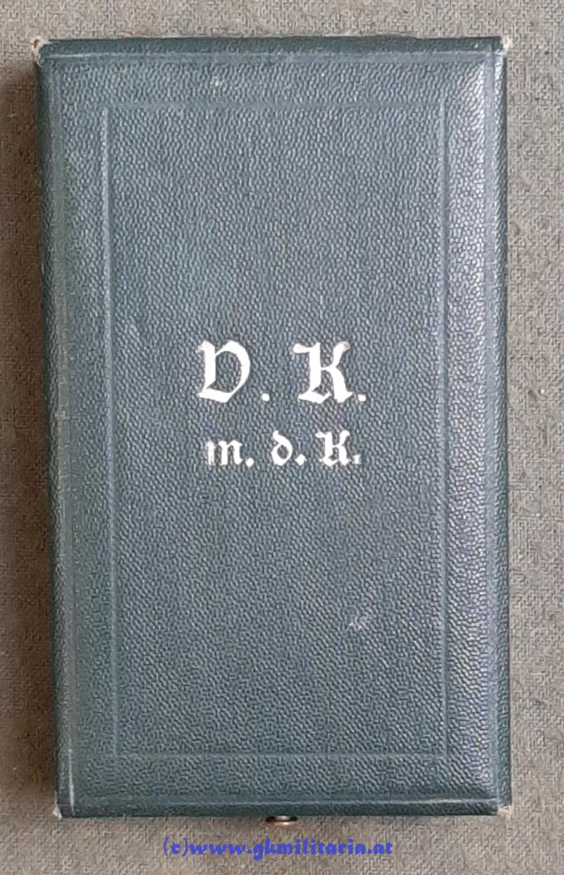 k.u.k. Silbernes Verdienstkreuz mit Krone - im "dunkelgrünen" Etui! - Silber punziert im Ring und Herstellerpunze V. Mayer, Wien - am originalem Band - im original dunkelgrünen Etui der Fa. Bergmann, Wien mit silbernen Aufdruck auf Vorderseite "V.K. m.d. K." - auf Rückseite Stempel 1915 - sehr guter Zustand!