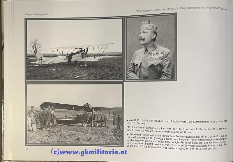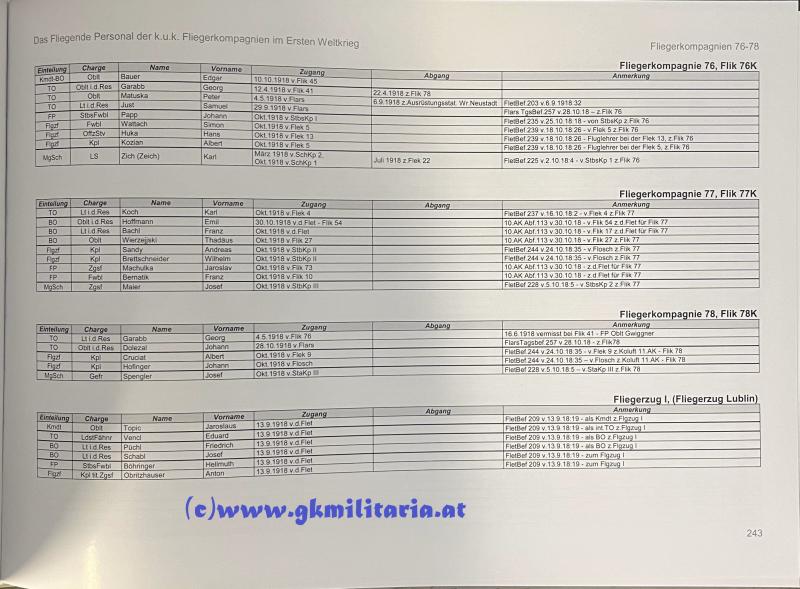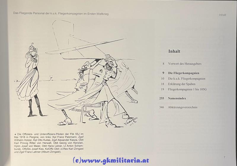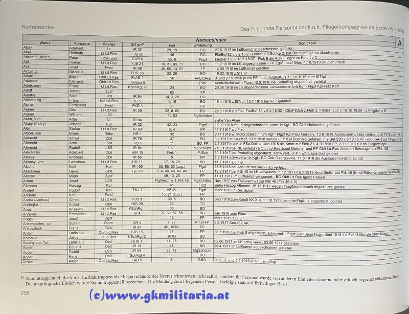 Im Mittelpunkt stehen die einzelnen Fliegerkompagnien der österreichisch-ungarischen Luftfahrtruppen, deren fliegendes Personal nach Einteilung und Zugang zur Einheit gelistet wird.