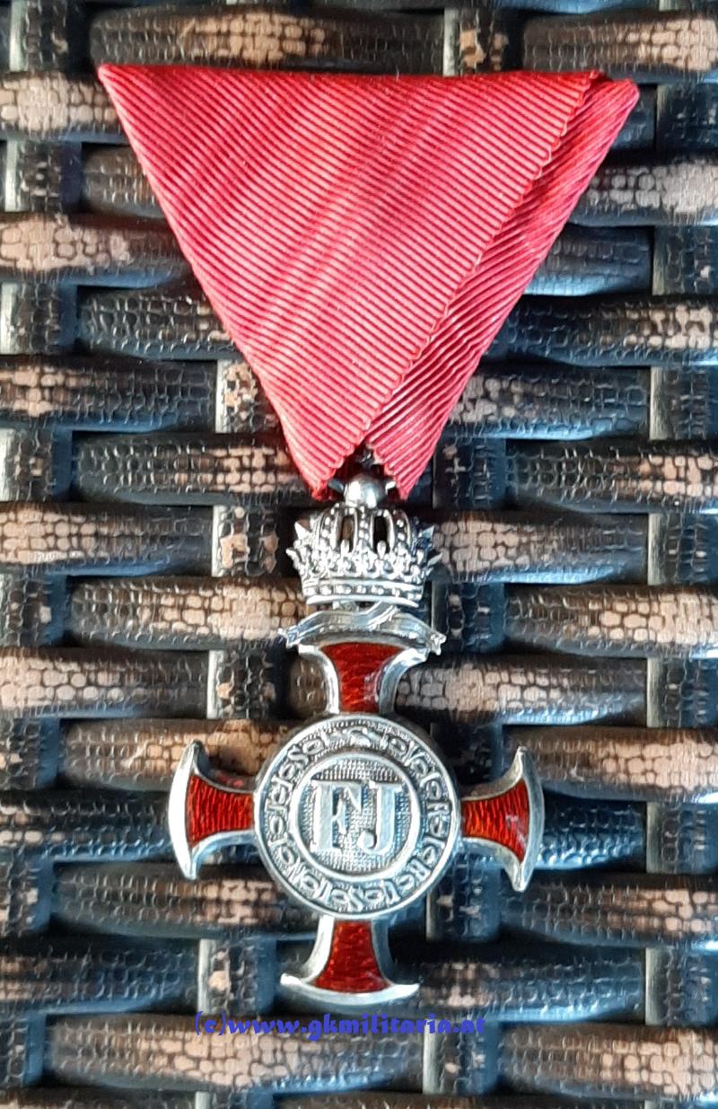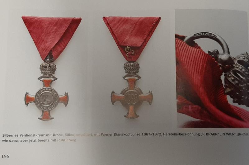 k.u.k. Silbernes Verdienstkreuz mit Krone - Braun, Wien! frühes Stück vor 1872! - Silber punziert Dianakopfpunze (1867-1872) und emailliert (geputzt) - im Ring Herstellerpunze F. Braun in Wien - am originalem frühen roten zivilen Band original vernäht - Im Buch vom Militaria Verlag Stefan Rest Österreichs Orden- & Ehrenzeichen Teil II/Band 1 auf Seite 196 zu finden - sehr guter Zustand! - Sehr schönes frühes Verdienstkreuz der Fa. Braun in Wien!