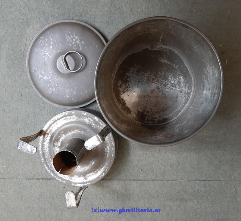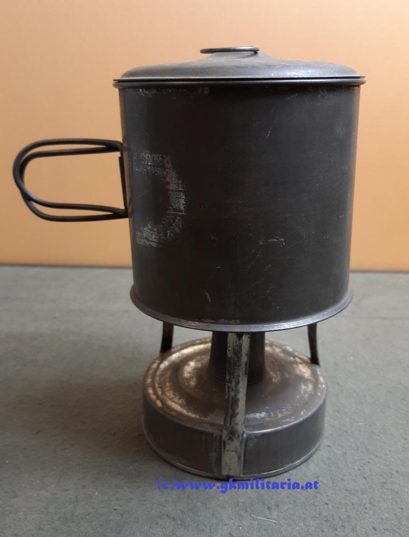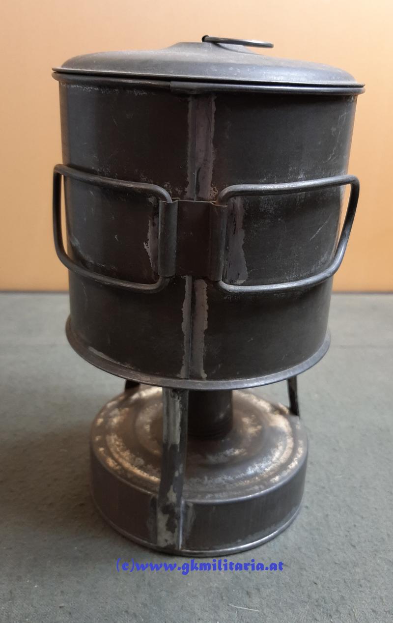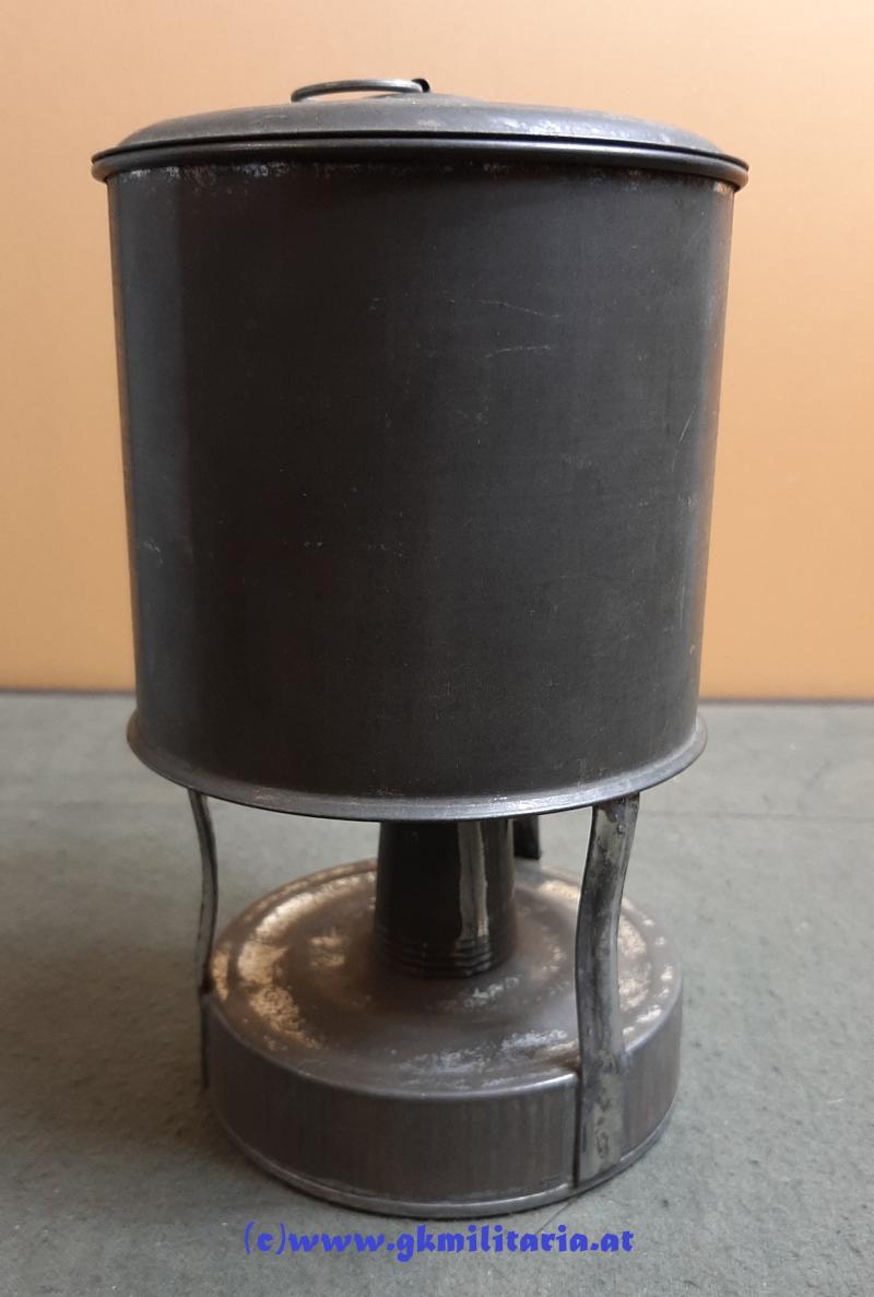 1. Weltkrieg Spirituskocher !! - 3-teilig - Höhe 16cm x 10,5cm - Gefäß mit klappbaren gewölbten Haltebügeln - Deckel mit Tragering - feldgrau - es fehlt nur der kleine Brennereinsatz - sonst sehr guter gebrauchter Zustand!