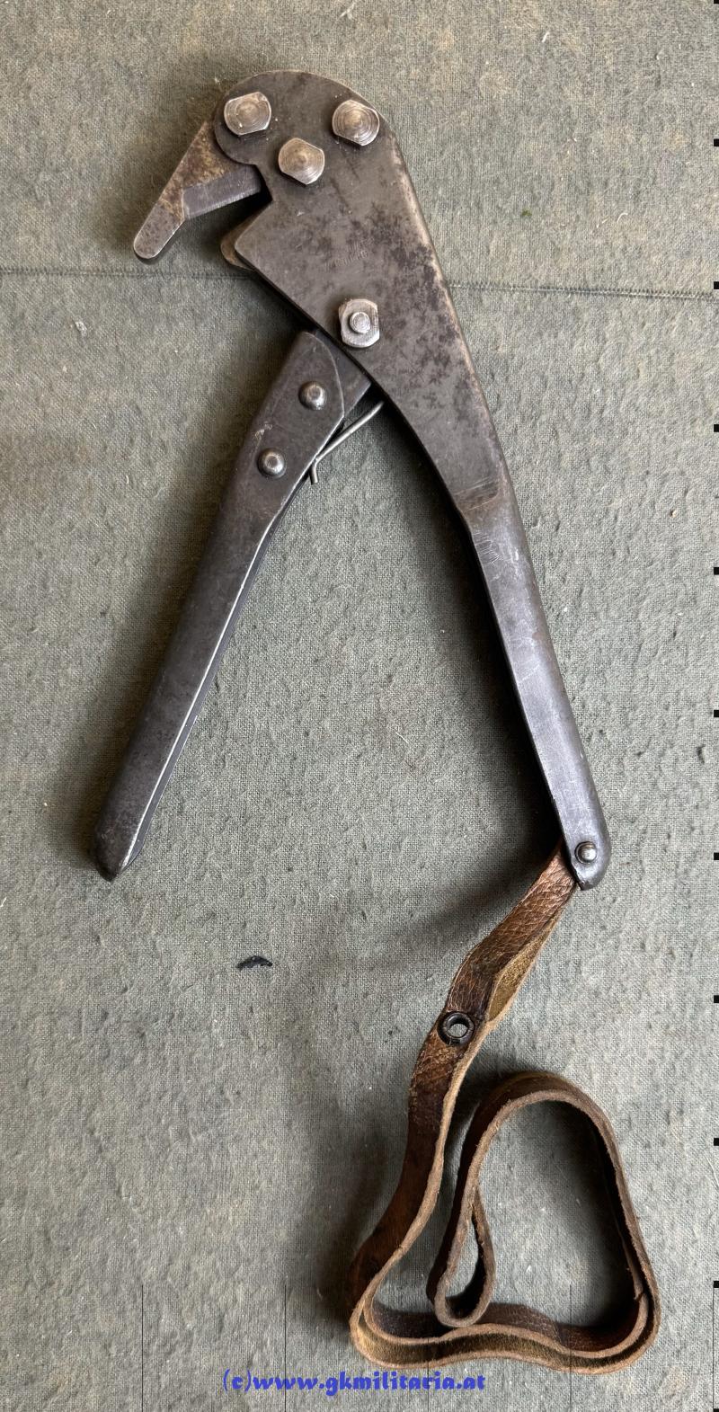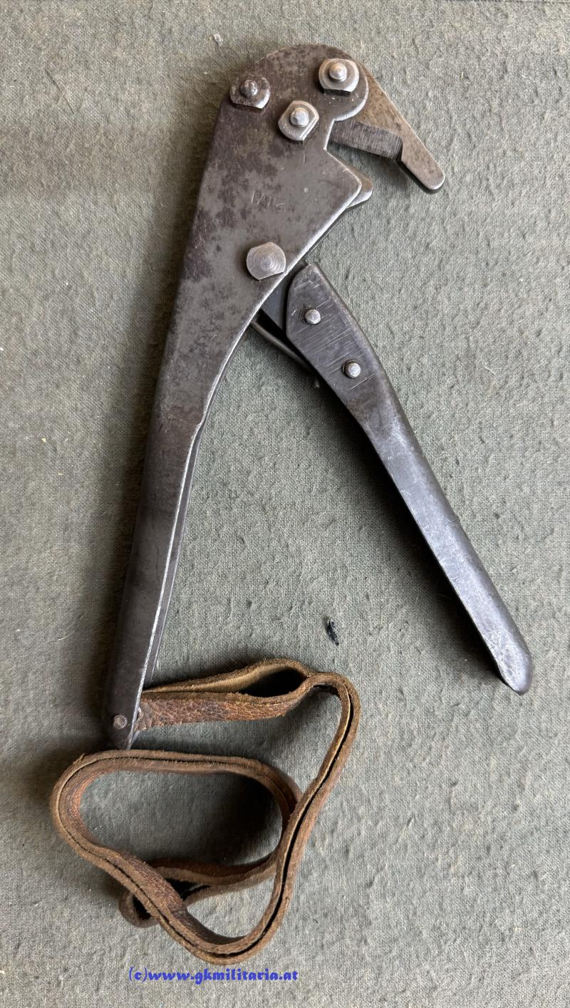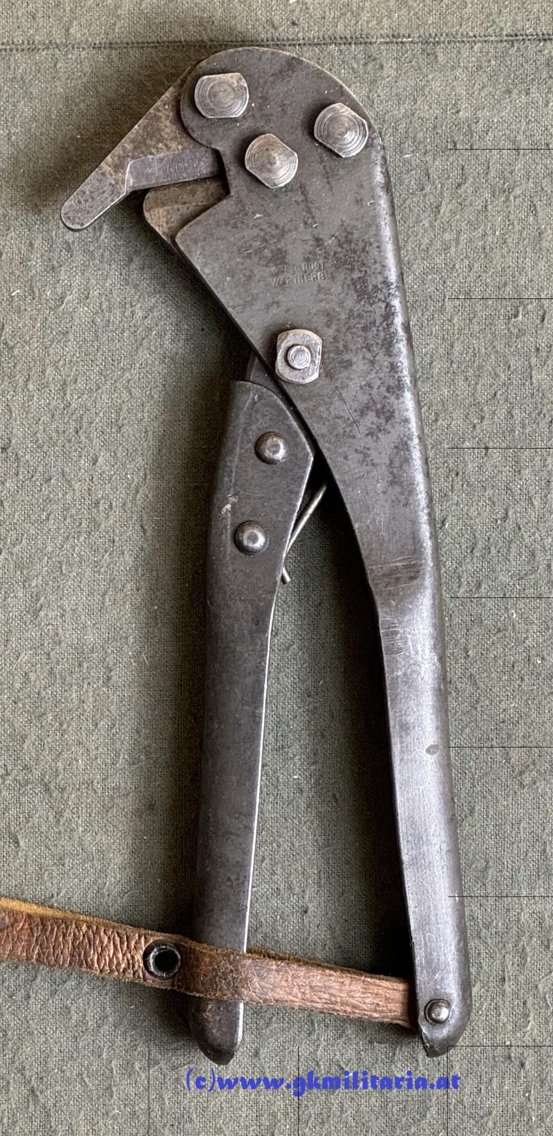 k.u.k. österr.-ung. "kleine" Drahtschere - "Sturmtruppe!!" - Eisen magnetisch - voll funktionstüchtig - sehr gute Federspannung -Herstellerstempel:"Vogel & Noot Wartberg" und auf der anderen Seite "PATENT" - mit kompletten, originalem Lederverschlussband - Diese kleinen Drahtscheren wurden zumeist von den k.u.k. Sturmtruppeinheiten verwendet - siehe Buch Militaria Verlag Stefan Rest "Sturmtruppen" auf Seite 105 - Länge ca. 20,3 cm - Sehr Guter Zustand - so komplett schon selten zu finden!