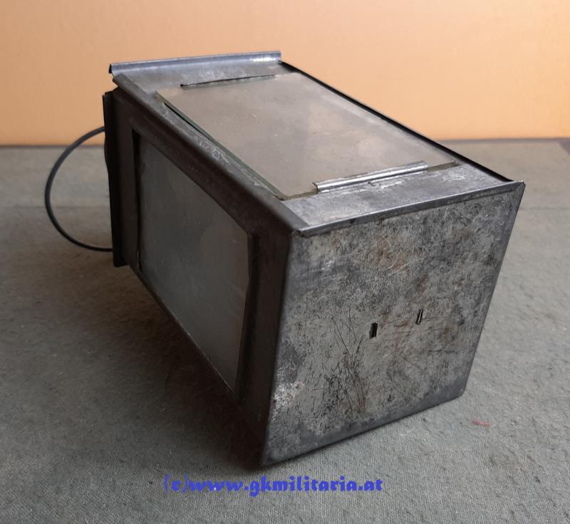 k.u.k. Laterne für Unterstände und Kavernen! - kleine Laterne - aus verzinnten Eisenblech - noch etwas feldgraue Farbe sichtbar - zum Aufhängen und zum Einhängen - wurde mit normalen Kerzen benutzt - 3 Scheiben Glas - das vordere zum Aufschieben - Abmessungen 15,5cm x 7cm x 7cm - sehr guter gebrauchter Zustand!