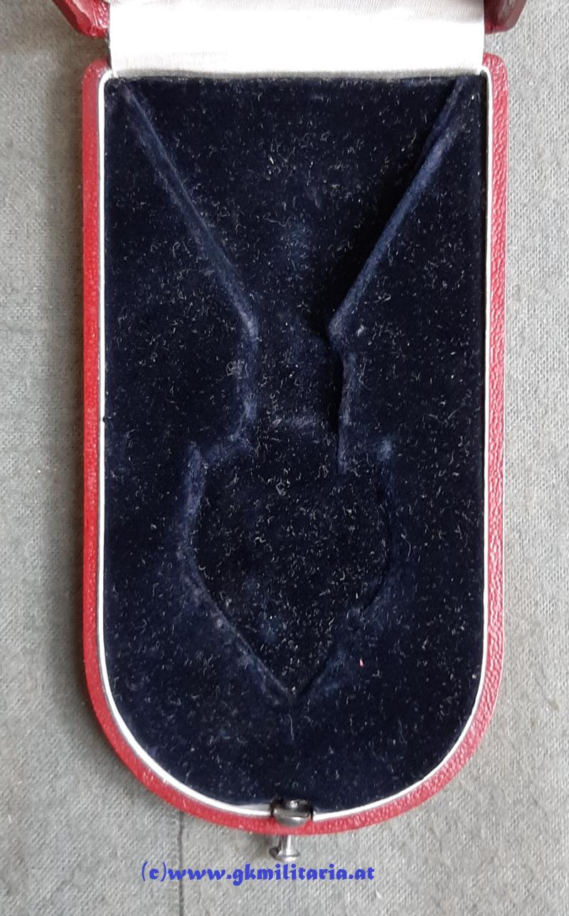 k.u.k. Etui für Franz Joseph-Orden Ritterkreuz - seltene Variante RIEMER, PRAG!! - innen im Deckel Herstellerstempel in schwarz ED. RIEMER, K.u.K. HOFJUWELIER PRAG, Graben 33 - wie bei Riemer Etuis typisch kein Aufdruck auf Vorderseite - schwarzes Inlay - 12cm x 6,5cm x 2cm - sehr guter gebrauchter Zustand! - Selten!