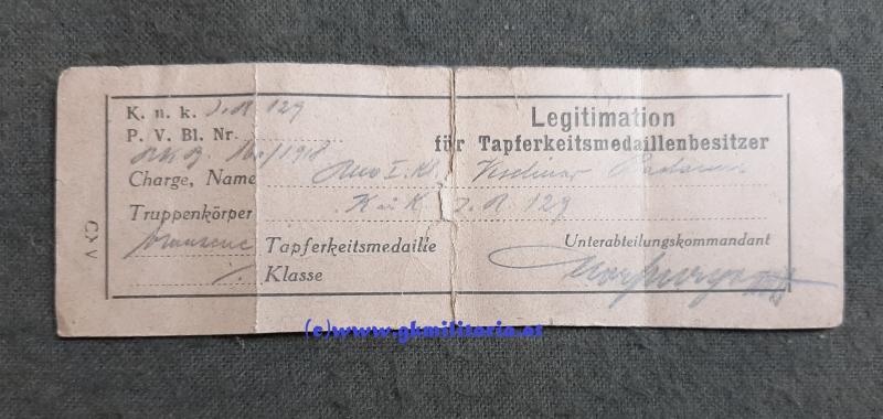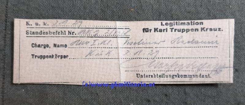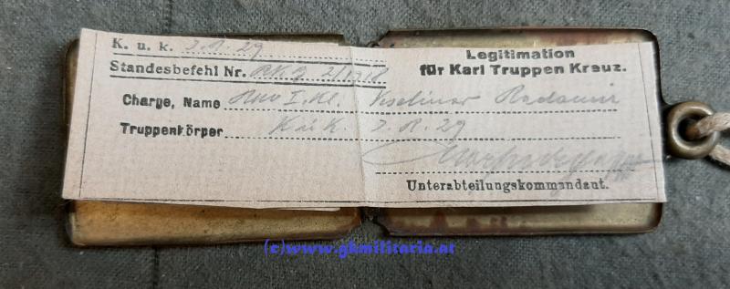 k.u.k. Legitimation Rm. 1. Kl. Veschinar Radomir Inf. Reg. 29/129 !! - bestehend aus: Legitimation für Karl Truppenkreuz beim Inf. Reg. 29 vom Feb. 1918 - Legitimation für die Bronzene Tapferkeitsmedaille beim Inf. Reg. 129 von 1918 - Kapsel aus Messing im gebrauchtem Zustand Klammer innen fehlt - sonst guter gebrauchter Zustand!