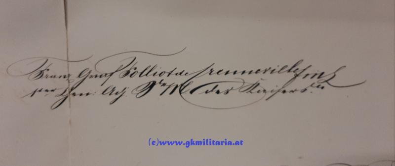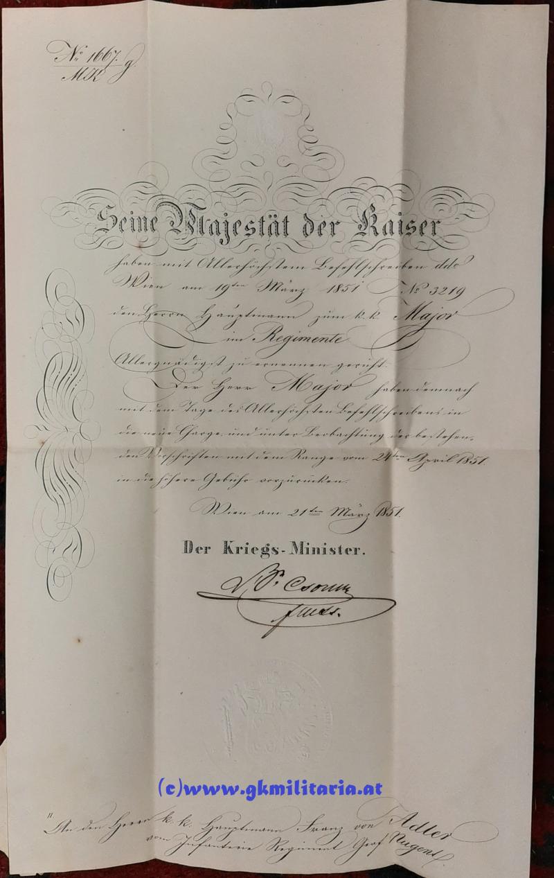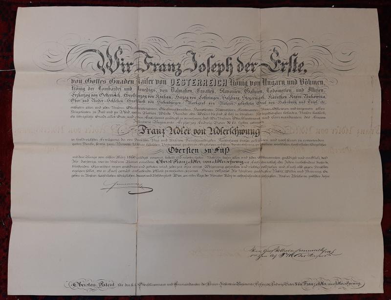 Urkundennachlass k.u.k. Oberst Franz Adler von Adlerschwung - Oberstpatent usw.!! - bestehend aus: Ernennung zum Major beim k.u.k. Infanterieregiment Graf Nugent Nr. 30 vom 21. März 1851 mit eigenhändiger originaler Signatur von FZM Anton Csorich von Monte Creto Kriegsminister 16. Juli 1850 – 7. März 1853 (Theresienritter) - Ernennung zum Kommandanten des k.u.k. Infanterie-Regimentes E.H. Ludwig Viktor Nr. 65 vom 29. Dezember 1859 mit eigenhändiger originaler Signatur von FMLT. Erzherzog Wilhelm Chef des Armeeoberkommandos 1857-1860 - Ernennung zum Oberst u. Kmdt. des Inf. Reg. Nr. 65 vom 2. März 1860 mit eigenhändiger originaler Signatur von FMLT. Erzherzog Wilhelm Chef des Armeeober -kommandos 1857-1860 - Oberstpatent vom 11. März 1860 zum Obersten zu Fuß mit eigenhändiger Signatur des Kaiser Franz Joseph I. und des Adjutanten des Kaisers General Franz Graf Folliot de Crenneville - Oberstpatent noch in toller Schmuckausführung mit bunten Namenszug des Obersten und originaler Unterschrift des Kaisers - toller Urkundennachlass eines Obersten und Regimentskommandanten der k.u.k. Armee aus den 1860er Jahren - Oberstpatent auf Rückseite bei den Faltlinien mehrmals mit Museumsband geklebt sonst sehr guter gebrauchter Zustand!