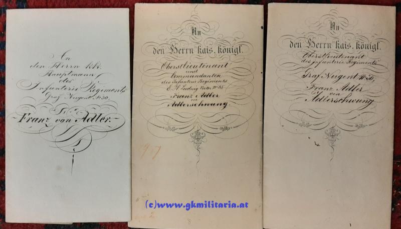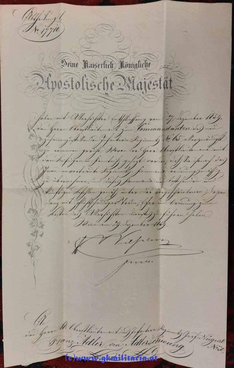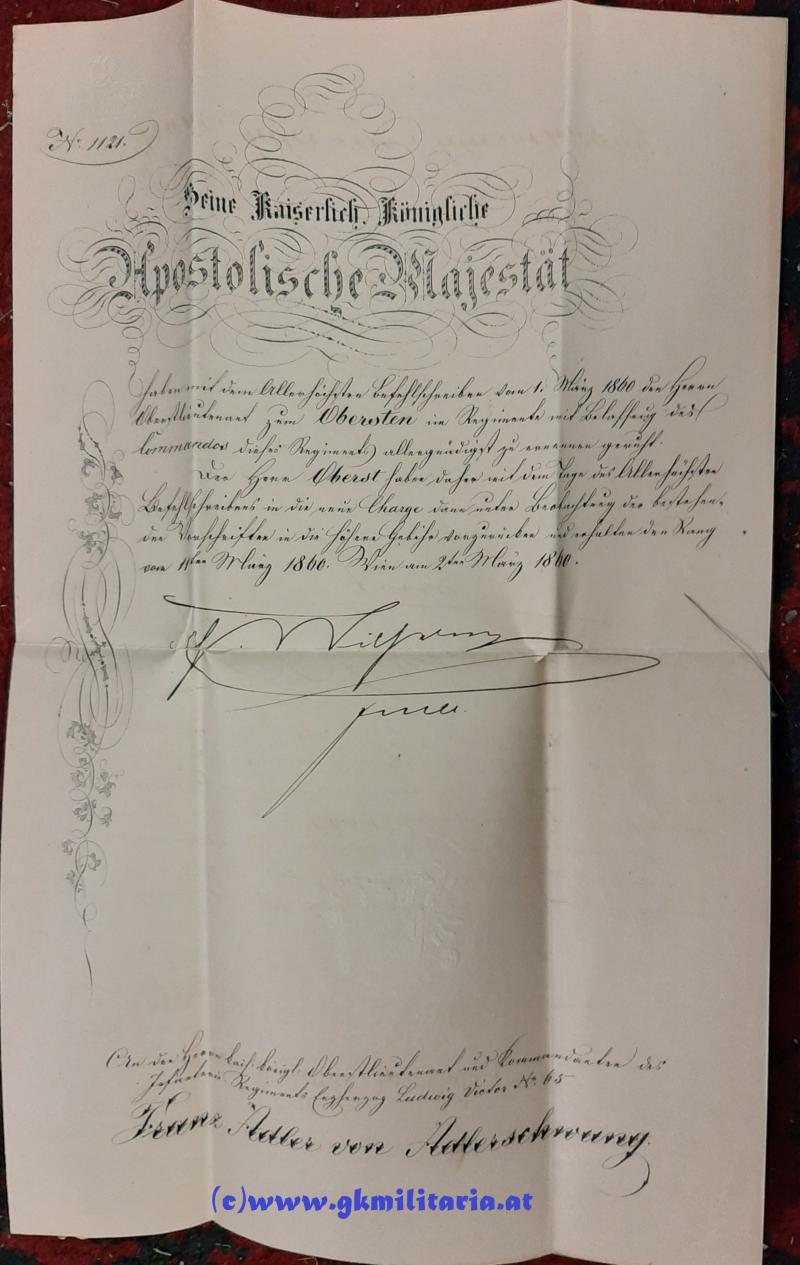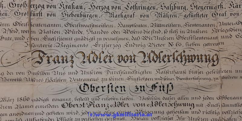 Urkundennachlass k.u.k. Oberst u. Kmdt. Inf. Reg. EH Ludwig Viktor Nr. 65 Franz Adler von Adlerschwung - Oberstpatent 1860 usw.!!