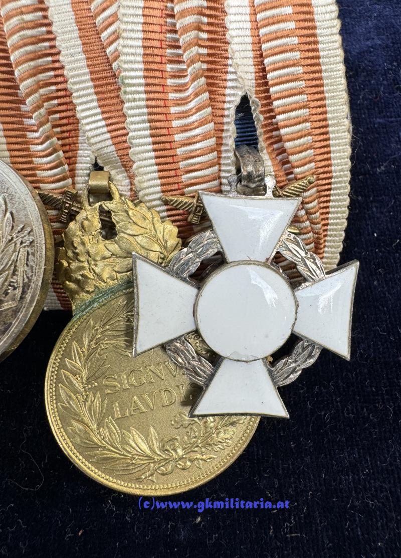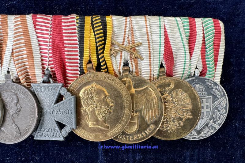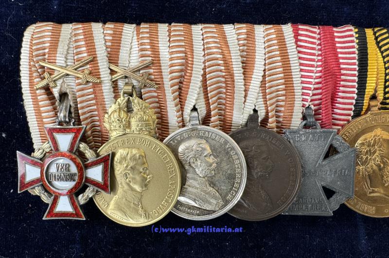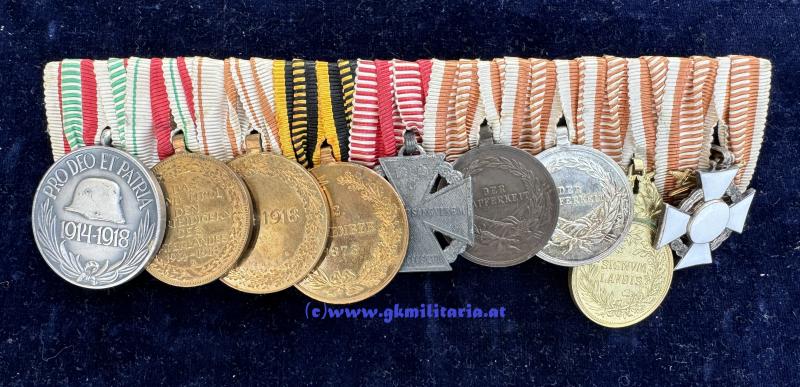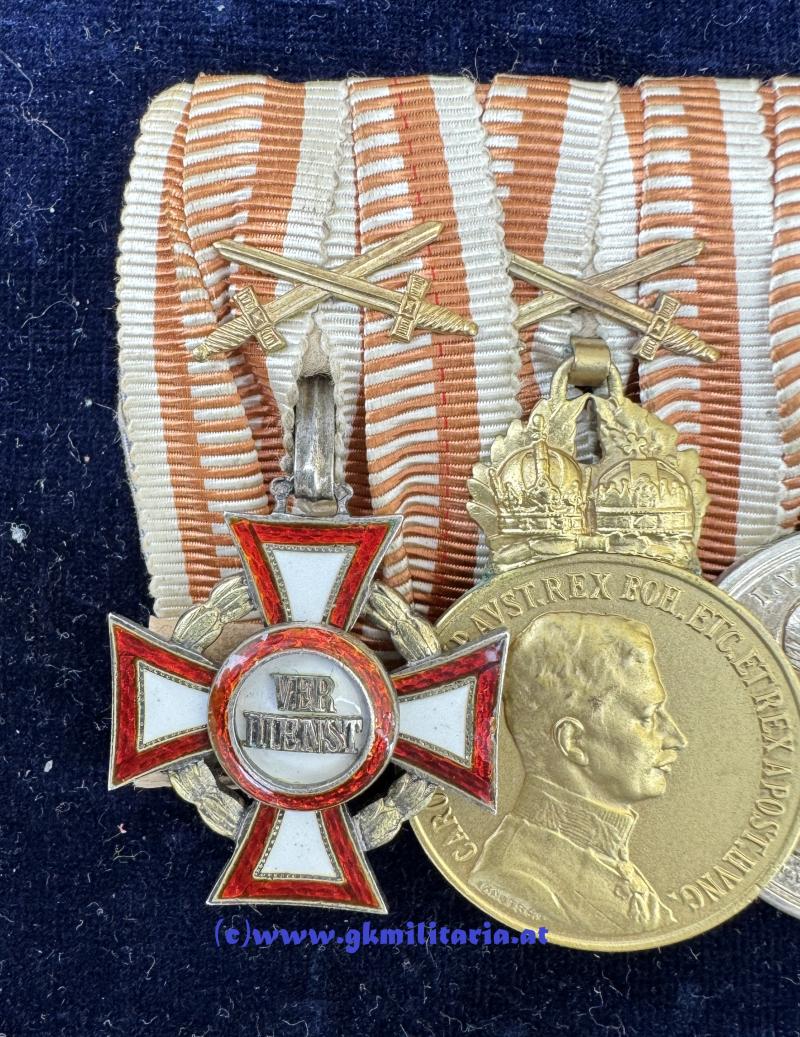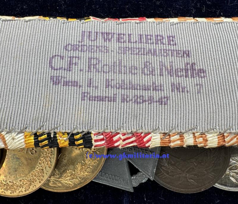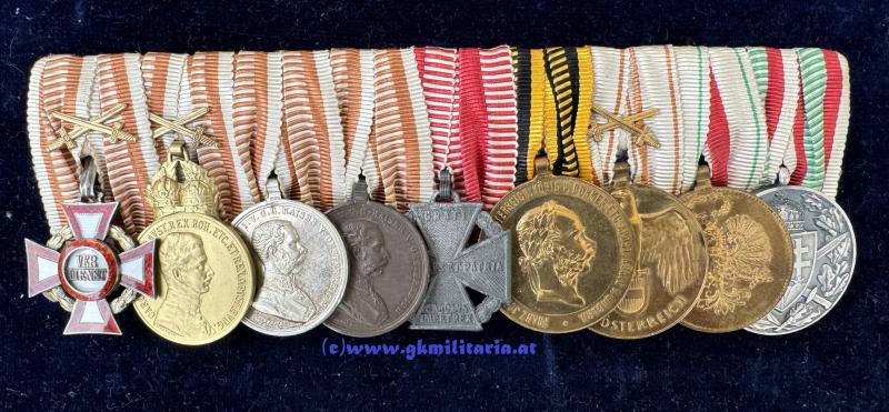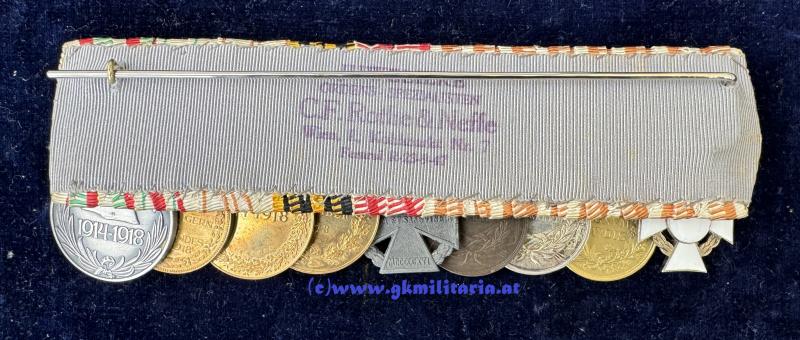 9-teilige k.u.k. Ordensspange - Deutsche Trageweise! - ROTHE, WIEN!! - bestehend aus: k.u.k. Militärverdienstkreuz 3. Klasse mit KD und Schwertern - Silber punziert und Herstellerpunze VM für Vinzenz Mayer, Wien (kleiner oberflächlicher Chip im roten Ring Mittelmedaillon vorne und im weißen Mittelmedaillon hinten) - Bronzene Militärverdienstmedaille Kaiser Karl mit Schwertern Stempelschneider Kautsch Stempel BRONZE im Rand - Silberne Tapferlkeitsmedaille 2. Klasse Kaiser Franz Joseph I. Stempelschneider Tautenhayn Seltene Variante Bronze versilbert mit Stempel BRONZE im Rand - Bronzene Tapferkeitsmedaille Kaiser Franz Joseph I. Stempelschneider Tautenhayn - Karl Truppenkreuz - Kriegsmedaille 1873 Bronze - Weltkriegserinnerungsmedaille Östereich 1914-1918 mit Schwertern - Tiroler Weltkriegserinnerungsmedaille 1914-1918 - Ungarische Weltkriegserinnerungsmedaille 1914-1918 - auf Rückseite lange Nadel für Montage auf Uniform - Deutsche Trageweise - auf Rückseite Herstellerstempel C.F. Rothe, Wien - dazu 2 Bandspangen für die Uniform welche sich mit 2 Stücken unterscheiden und zwar ist auf den Bandspangen auch das Frontkämpferkreuz und die Bulgarische Weltkriegserinnerungsmedaille 1915-18 montiert - sehr schöne 9-teilige Ordensspange für Offiziere der Firma C.F. ROTHE WIEN !!