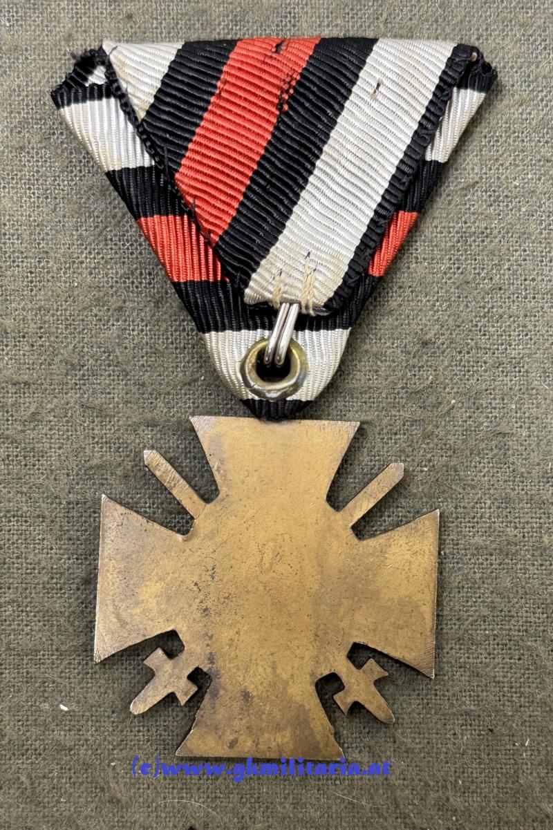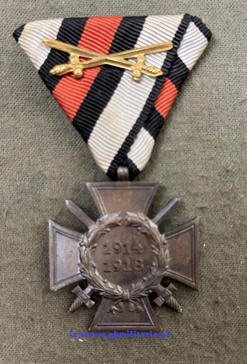 Frontkämpferkreuz 1914-1918 mit Schwertern - Österr. Tragweise!! - bronziert - am originalem österreichischen Dreiecksband mit Schwertern - sehr guter Zustand!