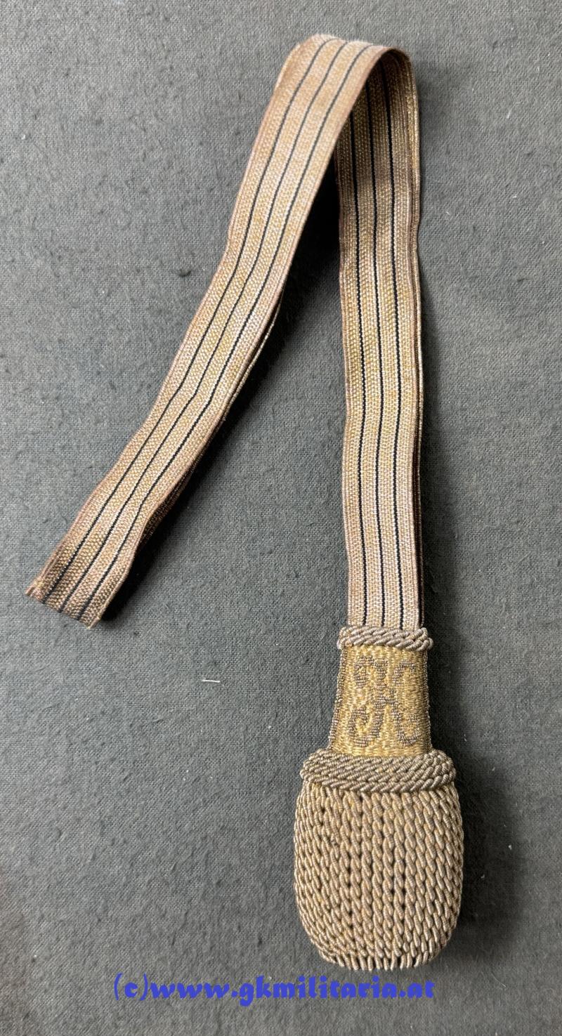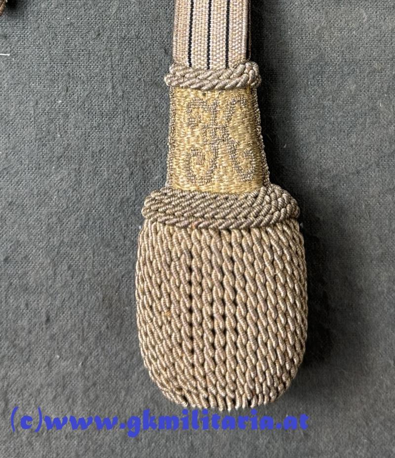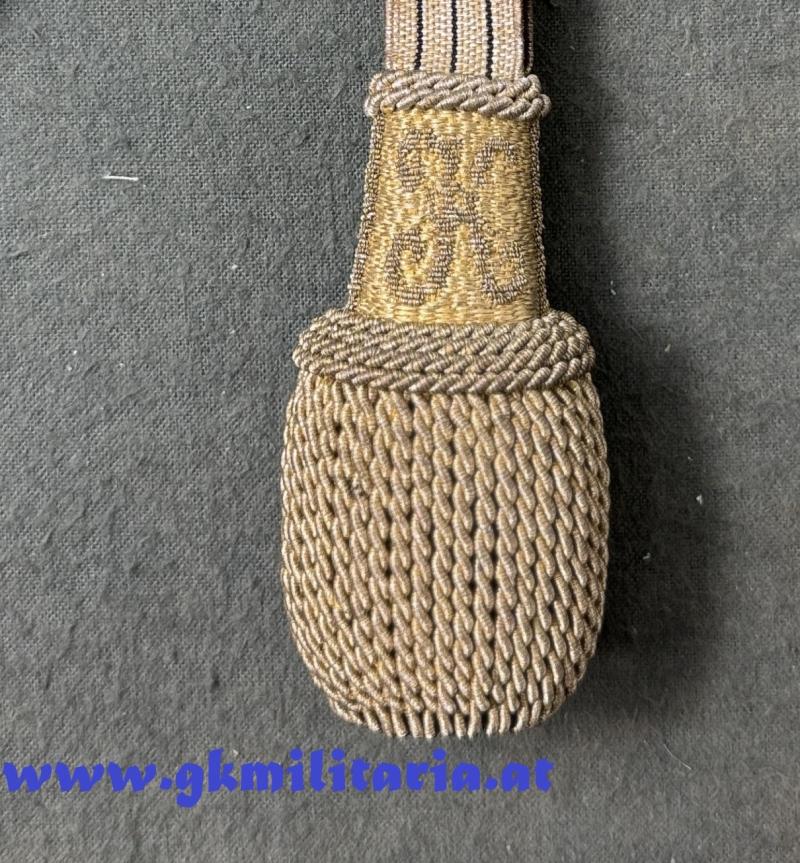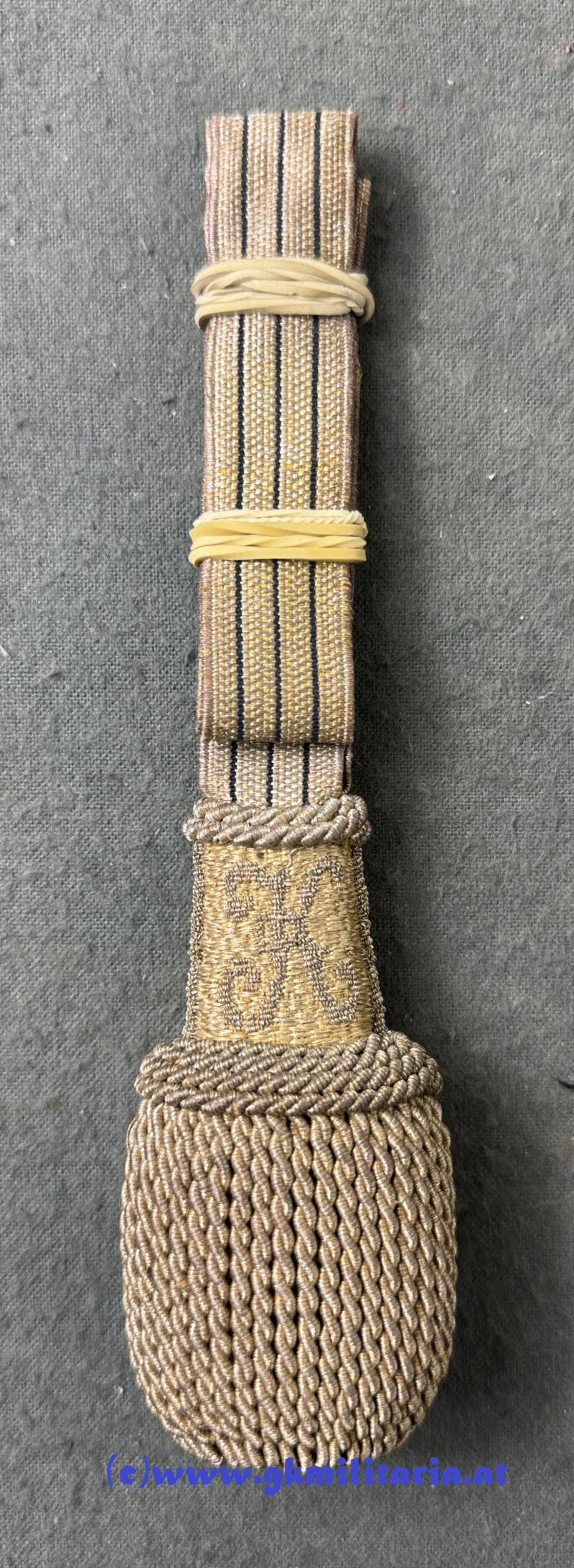 k.u.k. Portepee Kaiser Karl für Offiziere Bajonett!! - geschlossene Form für Bajonette - Band aus Goldgespinst mit 3 schwarzen Durchzügen - am Quastenkopf beidseitig allerhöchster Namenszug "K" für Kaiser Karl - sehr guter Zustand!