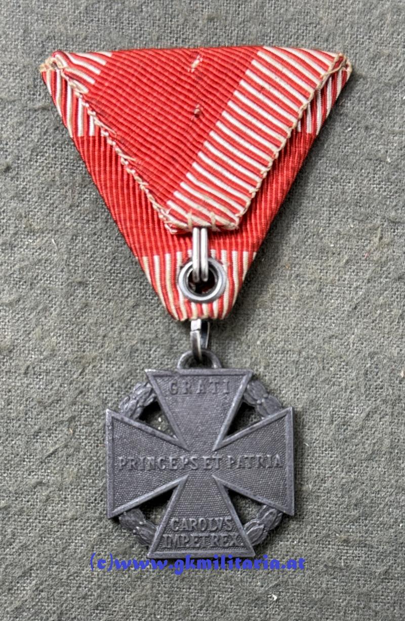 k.u.k. Karl Truppenkreuz - ohne Herstellerstempel mit varianten Bandring - Kriegsmetall - am originalem Band - sehr guter Zustand!