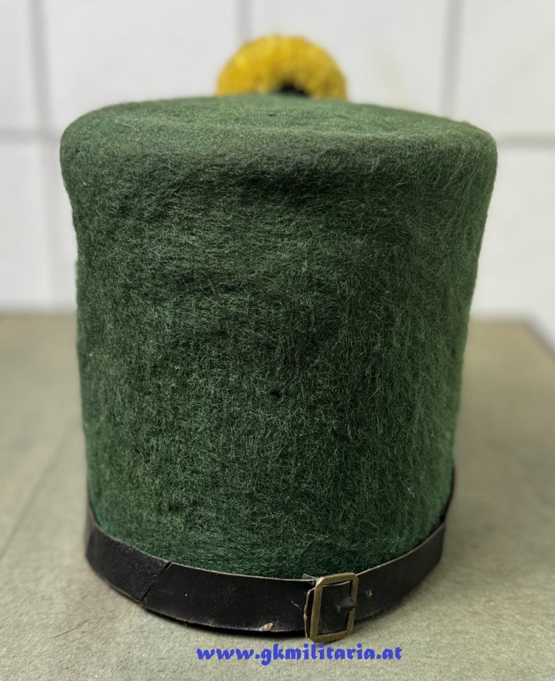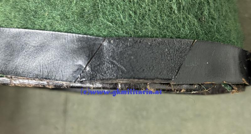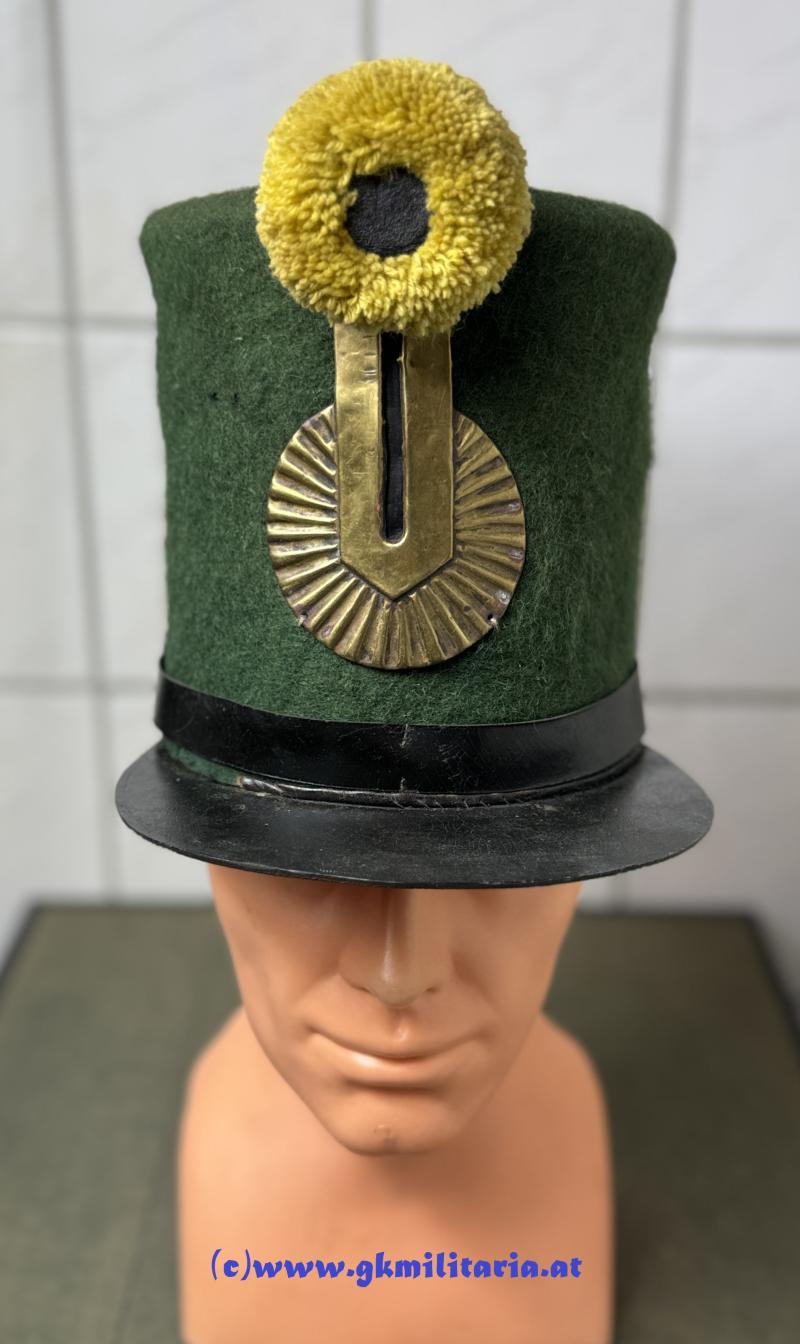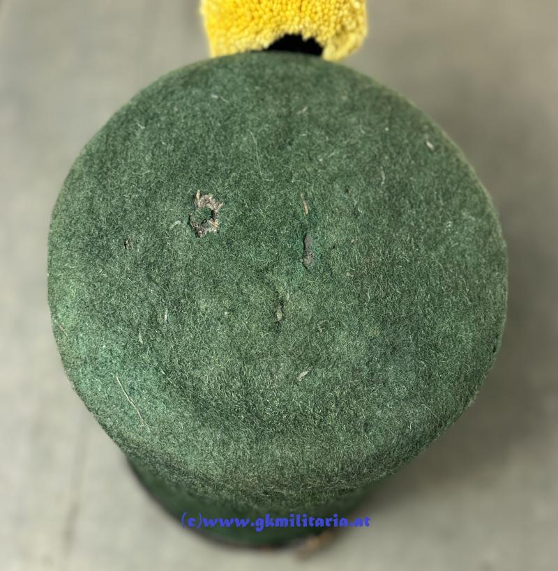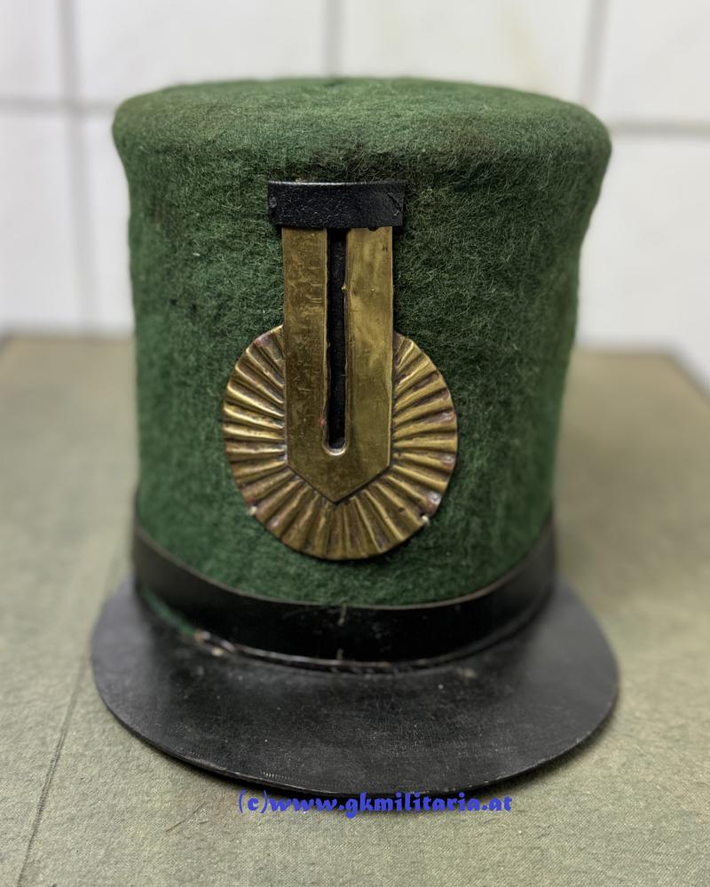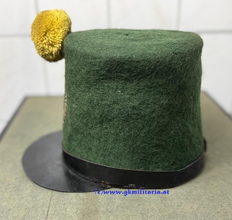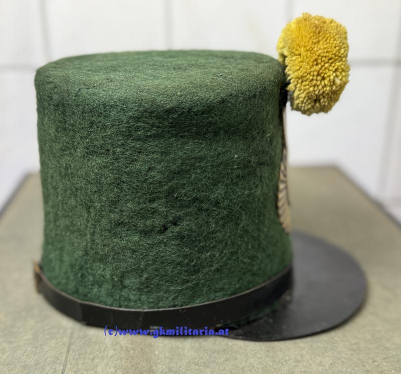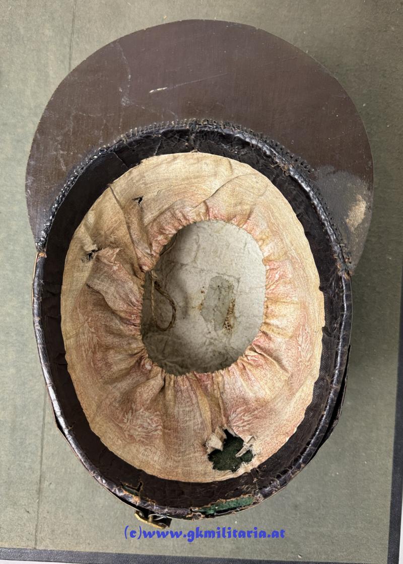 k.u.k. Tschako Bürgergarde 1837 !! - Korpus mit dunkelgrünem Filz überzogen (Oberseite mit 2 Löcher im Filz) - Vorderseite mit Metallschild mit Einschub für die Kokarde - Kokarde ist später um 1880 - schwarzer Lederschirm (dieser auf Unterseite etwas nachgenäht) - schwarzes Lederband mit Schnalle auf Rückseite (dieses auf ca. 5cm restauriert) - innen Futter aus dünnem Leinenstoff etwas beschädigt - schwarzes Schweißleder mit Ausbesserung - dem Alter entsprechend guter gebrauchter Zustand eines seltenen Tschakos mit späterer Kokarde!!