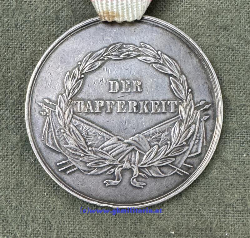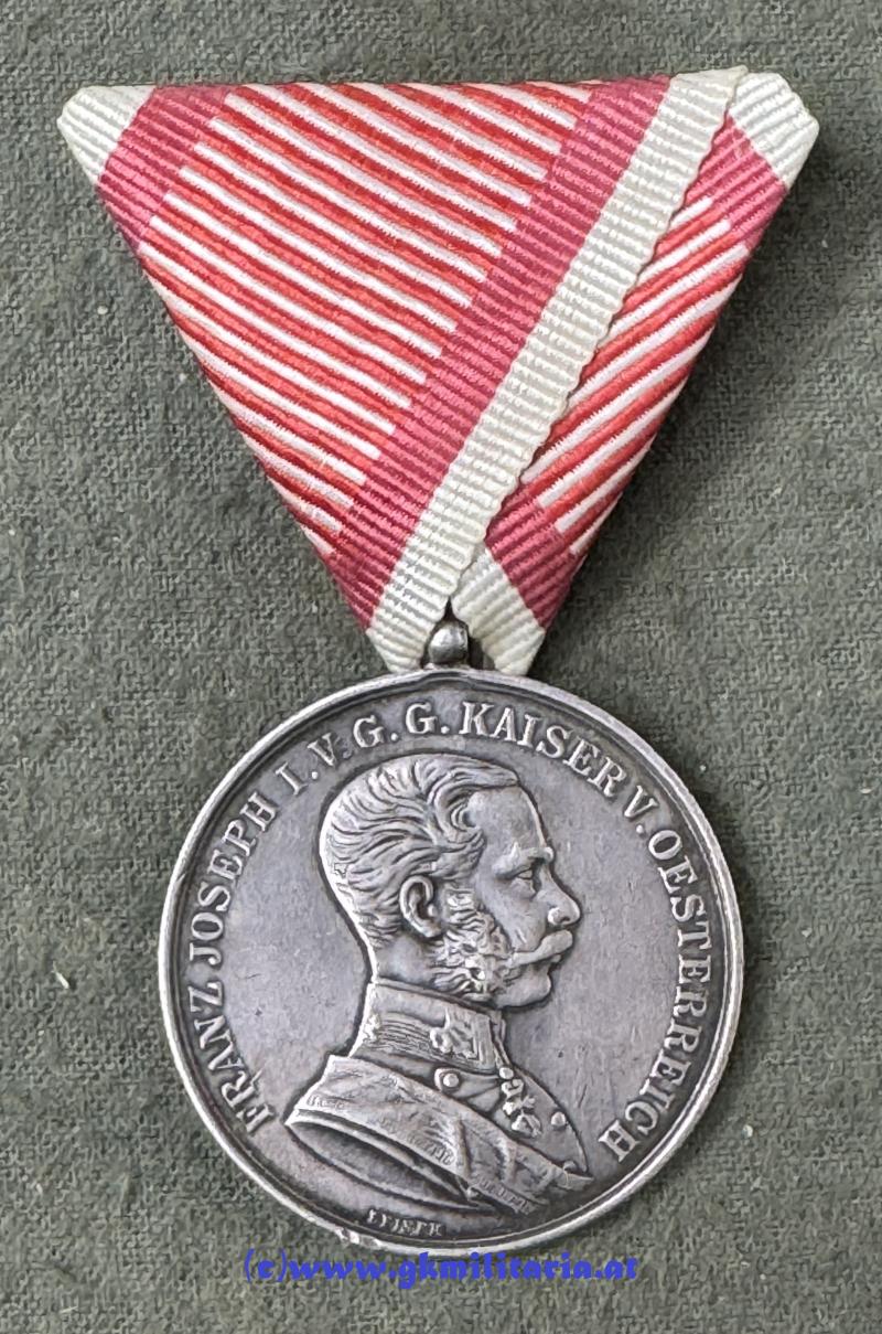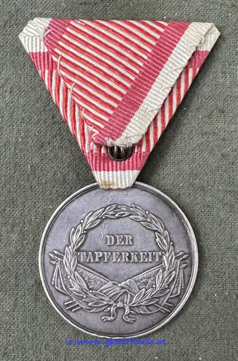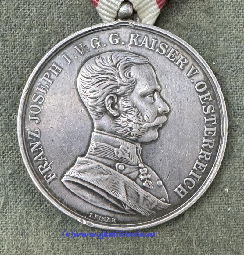 k.u.k. Silberne Tapferkeitsmedaille 1. Klasse Kaiser Franz Josef I. - Silber "A" punziert im Rand für Kontrollamtspunze HMA Wien - Stempelschneider Leisek - am originalem Band - sehr guter gebrauchter Zustand!
