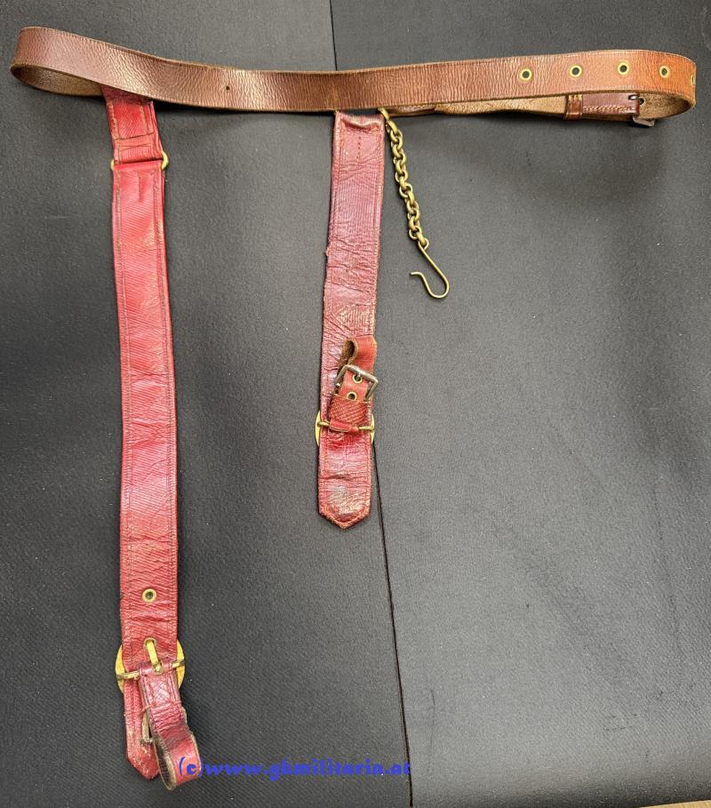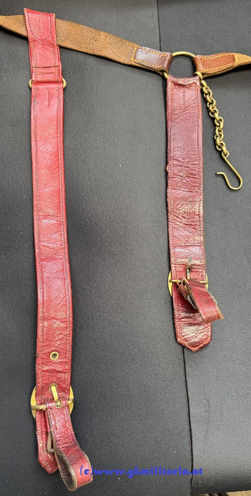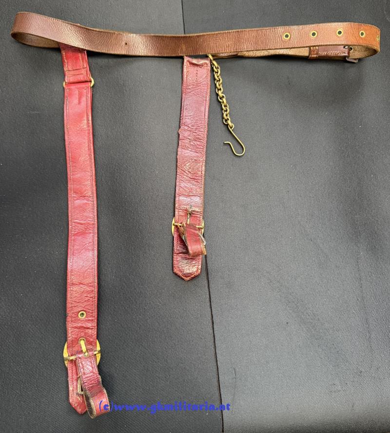 k.u.k. Säbelgehänge für Offiziere!! - die 2 Hänger für den Säbel mit Offiziersborte aus Goldgespinst und schwarzem Durchzug und auf Rückseite mit rotem Safianleder belegt (der lange Hänger ergänzt und oben geklebt) - dazu Kettensicherung für den Säbel - Gürtel aus braunem Leder - guter gebrauchter Zustand!
