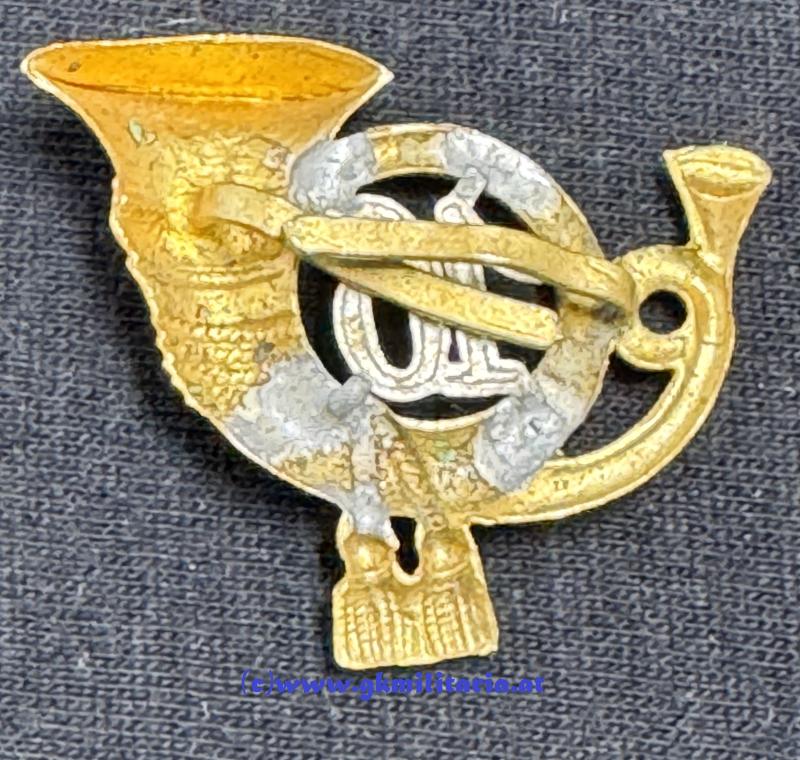 k.k. Jägerhorn für die Feldkappe des k.u.k. Feldjägerbataillons Nr. 16 - Tombak geprägt feuervergoldet - auf der Rückseite 2 Splinten zur Befestigung - sehr guter Zustand!