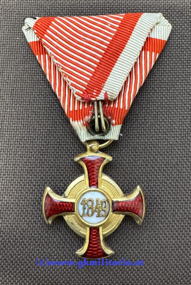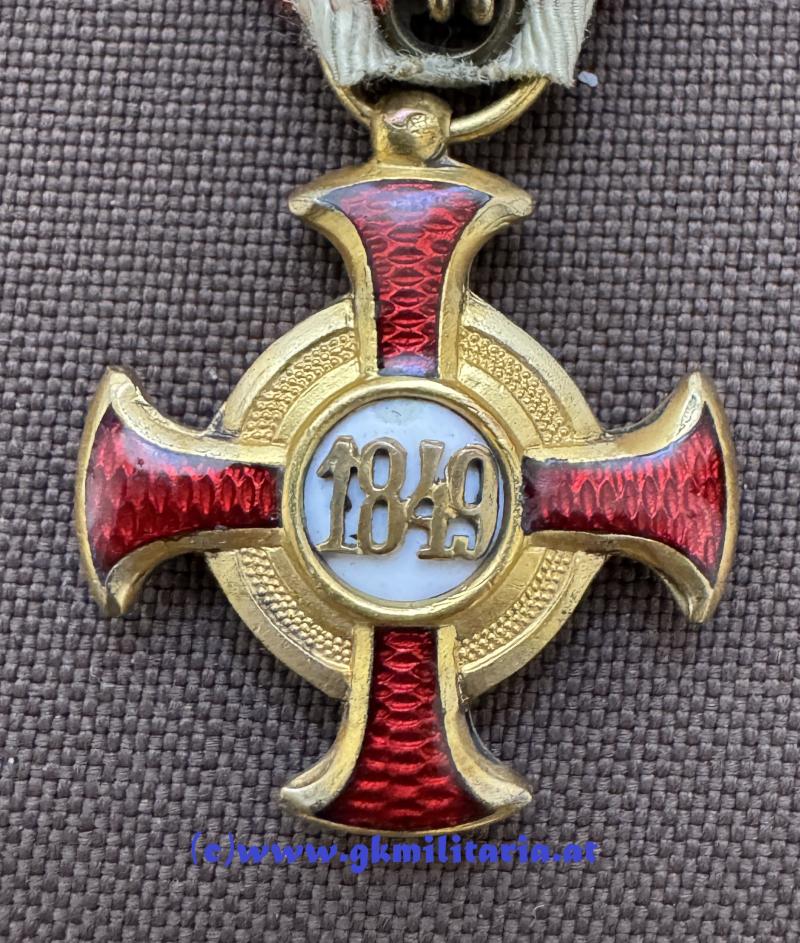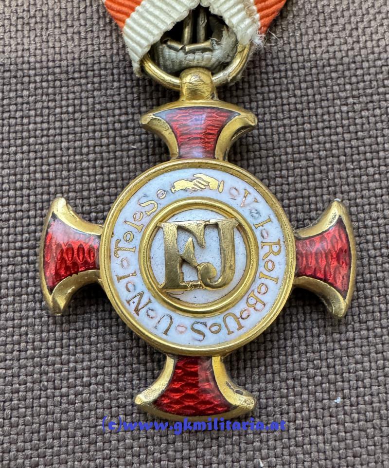 k.u.k. Goldenes Verdienstkreuz !! - vergoldet (Sternpunze) und emailliert (kl. Chip im Mittelmedaillon auf der Rückseite) - im Ring Herstellerpunze W. KUNZ, Wien - am originalem Band (leicht verschlissen) - sonst sehr guter Zustand!