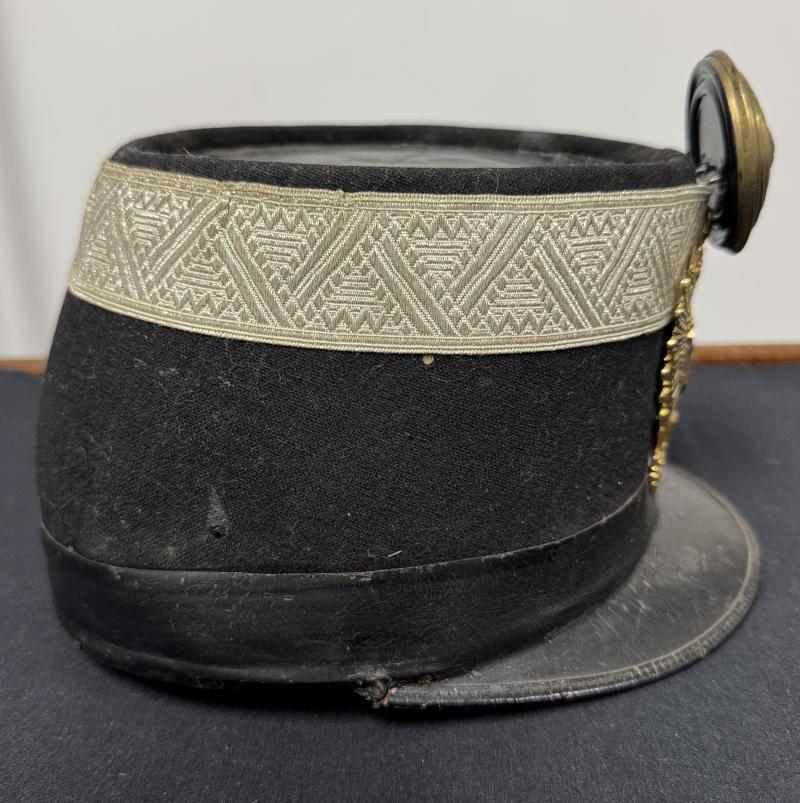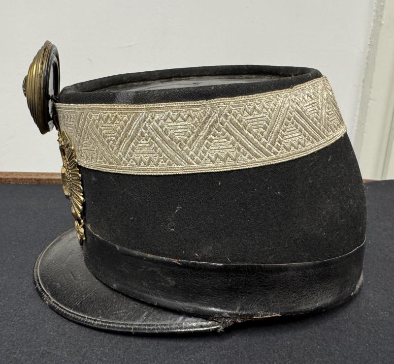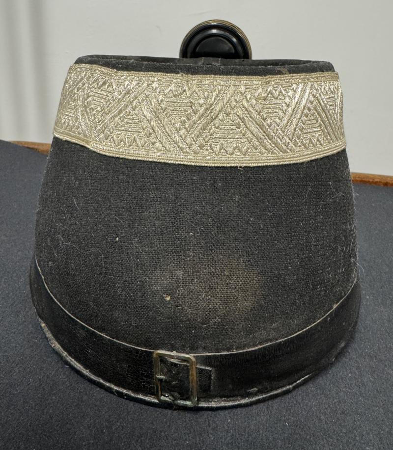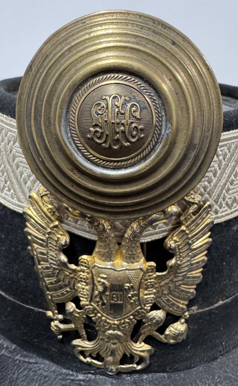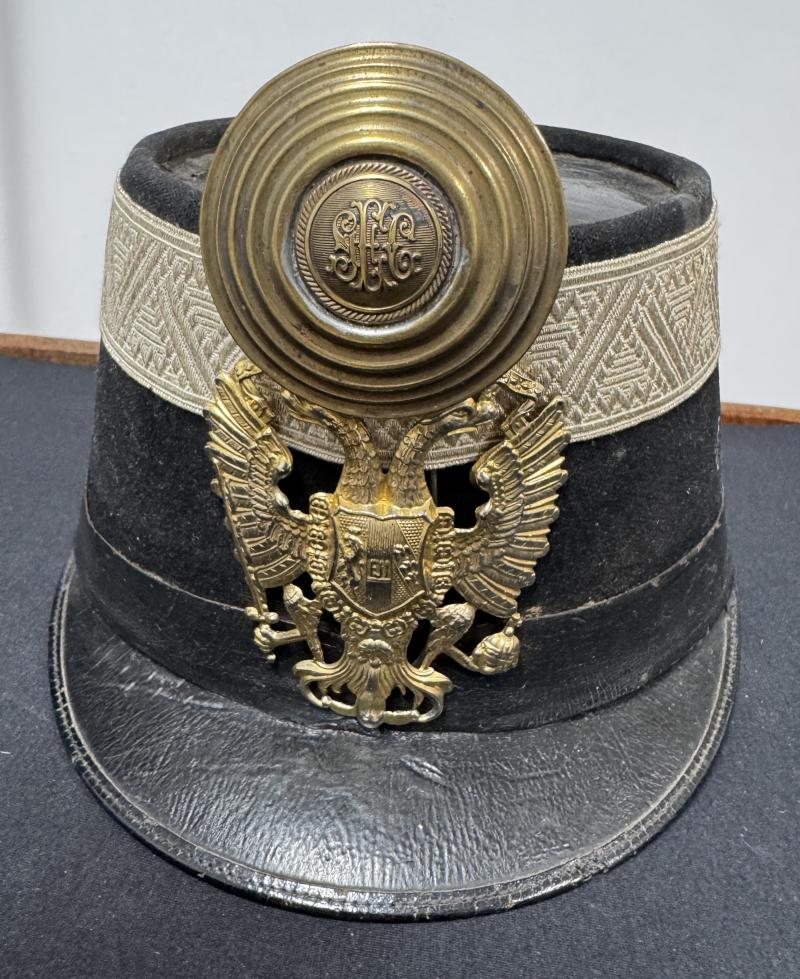k.u.k. Tschako für Traditionsverein!! - Neufertigung - mit einigen originalen Teilen - mit Silberborte - Doppeladler - Kokarde zum Einstecken mit den Buchstaben "SEC" - originaler Kinnriemen angenäht - gebrauchter Zustand!