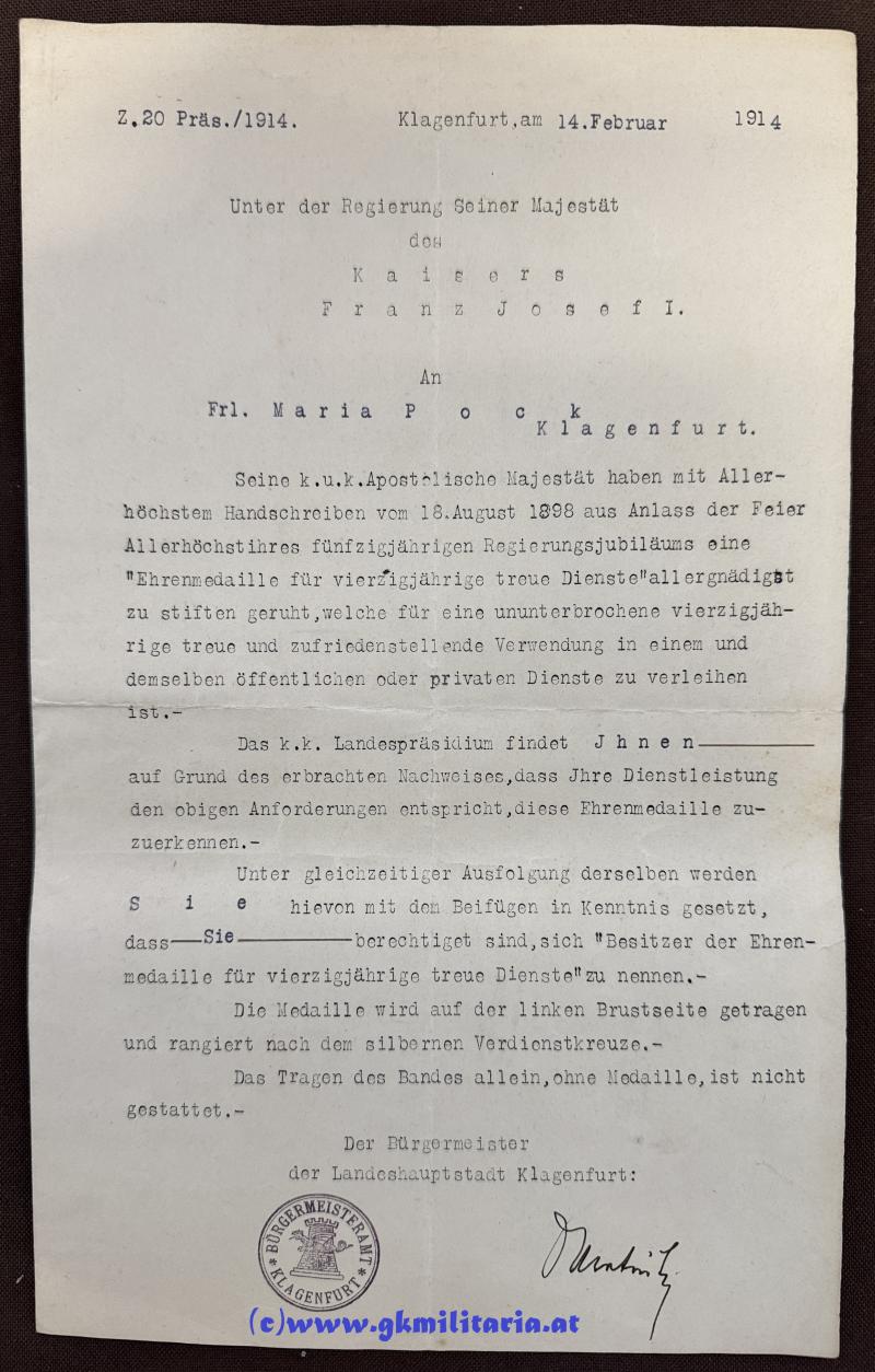 Urkunde und Ehren-Medaille für 40-jährige treue Dienste! - "verliehen an eine Frau!" - SELTEN!! - Urkunde für Frau Maria POCK, Klagenfurt vom 14. Februar 1914 verliehen von Kaiser Franz Joseph I. und ausgestellt vom Bürgermeister der Stadt Klagenfurt Dr. Gustav Ritter von Metnitz mit originaler eigenhändiger Unterschrift von Bürgermeister Ritter von Metnitz - dazu die Ehren-Medaille für 40-jährige treue Dienste am originalem roten Band - sehr guter Zustand! - Selten!