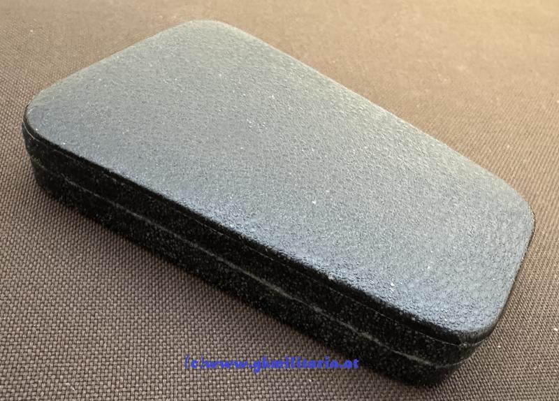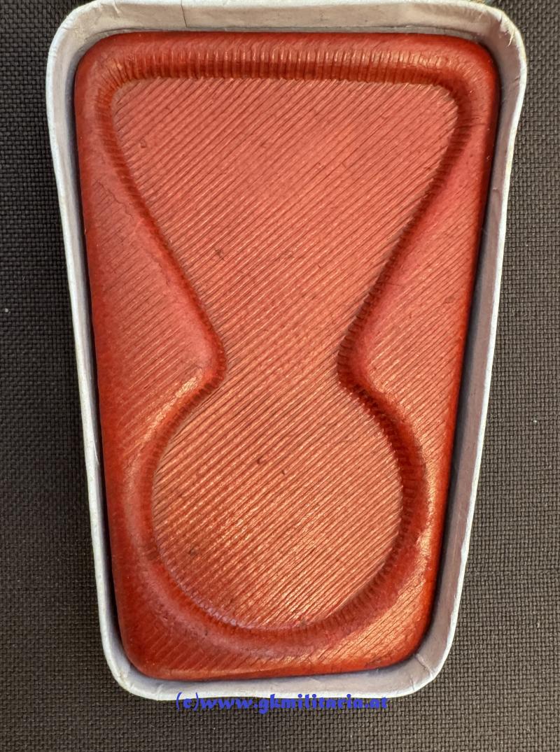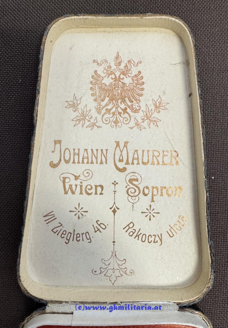 k.u.k. Jubiläumskreuz mit Etui !! - Bronze vergoldet - am originalem Band für Militär - im sogenannten schwarzen originalem Sargetui - Hersteller Johann Maurer, Wien & Sopron - rote Einlage etwas verzogen sonst sehr guter Zustand!