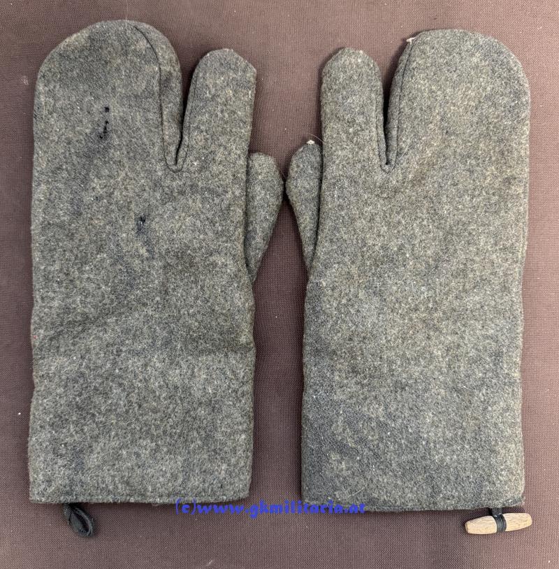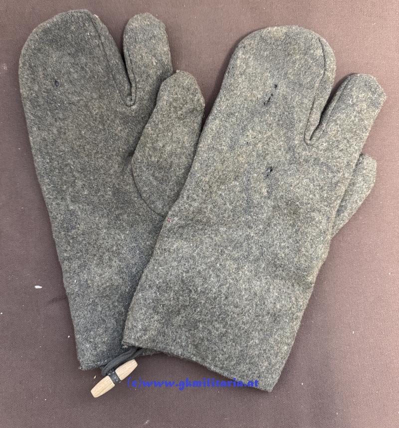 k.u.k. Kälteschutz-Fäustlinge mit Abzug-Zeigefinger! - aus grobem Wollstoff gefertigt - Schlaufe mit Olive aus Holz zum Zusammenbinden - leichte Lager- und Altersspuren - einige kleinere Löcher - guter gebrauchter Zustand! - selten!