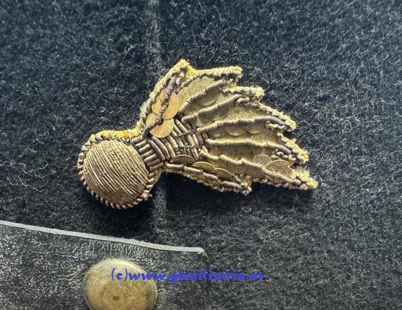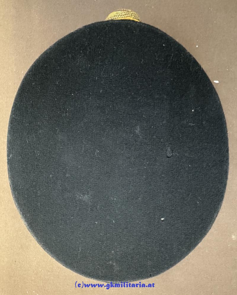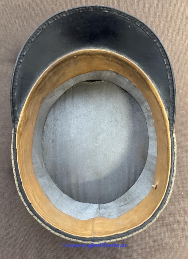 Österreich 1. Republik - schwarze steife Kappe Offiziere Gendarmerie!! - formstabiler Korpus mit schwarzem Wollstoff überzogen (2 Löcher im Deckel) - umlaufend schwarz durchwirkte goldene Kappenschnur für Offiziere - in der Mitte vorne rot-weiß-rot emaillierte Kappenkokarde für Offiziere - rechts goldgestickte Granate für Offiziere - goldene Knöpfe - Sturmriemen aus schwarzem Kunstleder - schwarzer Kunststoffschirm - schönes braunes Stirnleder - silbernes Seideninnenfutter - sehr guter gebrauchter Zustand!!