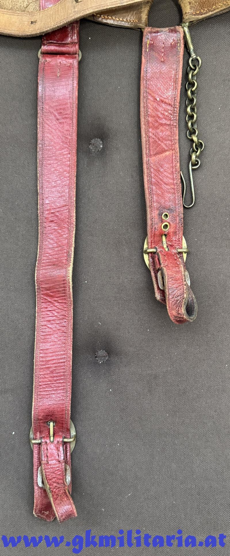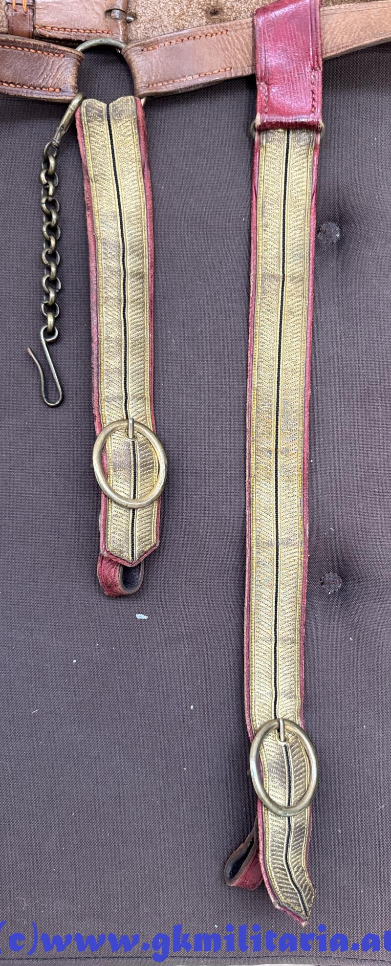 k.u.k. Säbelgehänge für Offiziere!! - die 2 Hänger für den Säbel mit Offiziersborte aus Goldgespinst und schwarzem Durchzug und auf Rückseite mit rotem Safianleder belegt - dazu Kettensicherung für den Säbel - Gürtel aus braunem Leder (gekürzt und neue Löcher) - sonst guter gebrauchter Zustand!