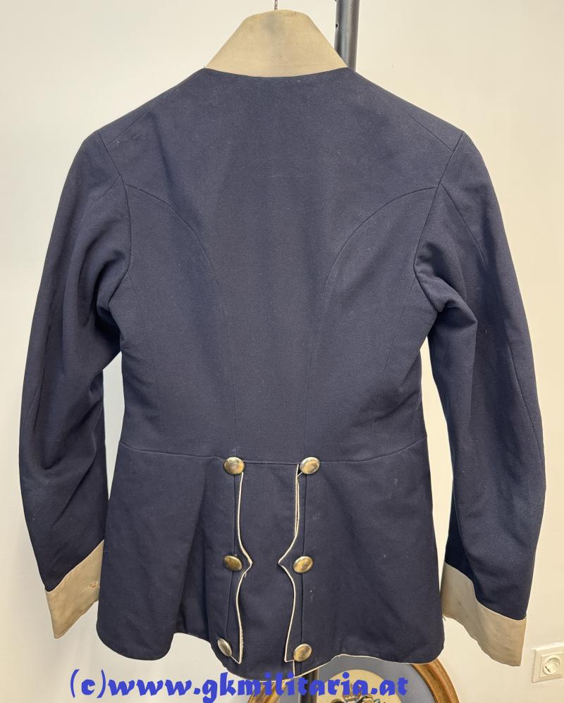 k.u.k. Waffenrock Oberleutnant Infanterieregiment Nr. 98!! - Beschreibung: Dunkelblaues Grundtuch (Vorderseite mit kleinen Löchern, Stehkragen, Ärmelaufschläge und alle Rockkantenvorstöße aus lichtdrappen Egalisierungstuch. - Vorstöße bei den Ärmeln mit Beschädigungen an der Kante und einer mit 2 Mottenlöchern auf der Rückseite - Auf den Kragenenden je 2 Distinktionssterne eine Reihe zu sechs glatten, versilberten Knöpfen, die geschweiften Schoßtaschenpatten auf der Rückseite mit je drei ebensolchen Rockknöpfen besetzt. Das Oberleibfutter und der Schoßteil schwarz gefüttert - In den Ärmeln Stempel Kostümverleih Lambert Hofer Wien - Rock im gebrauchtem Zustand!