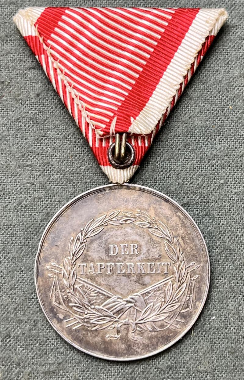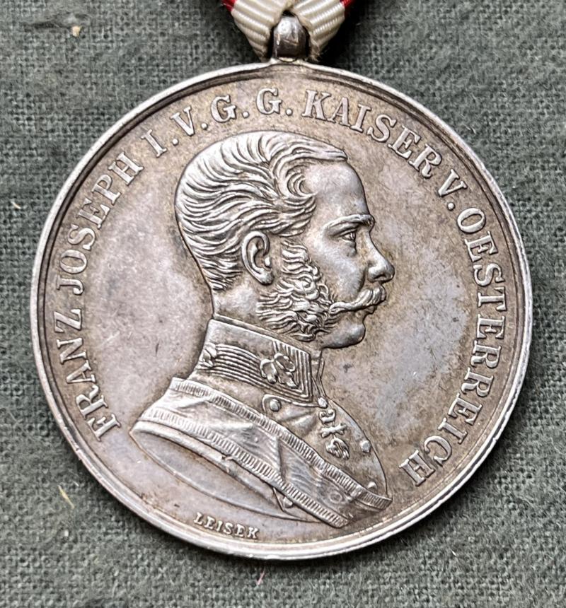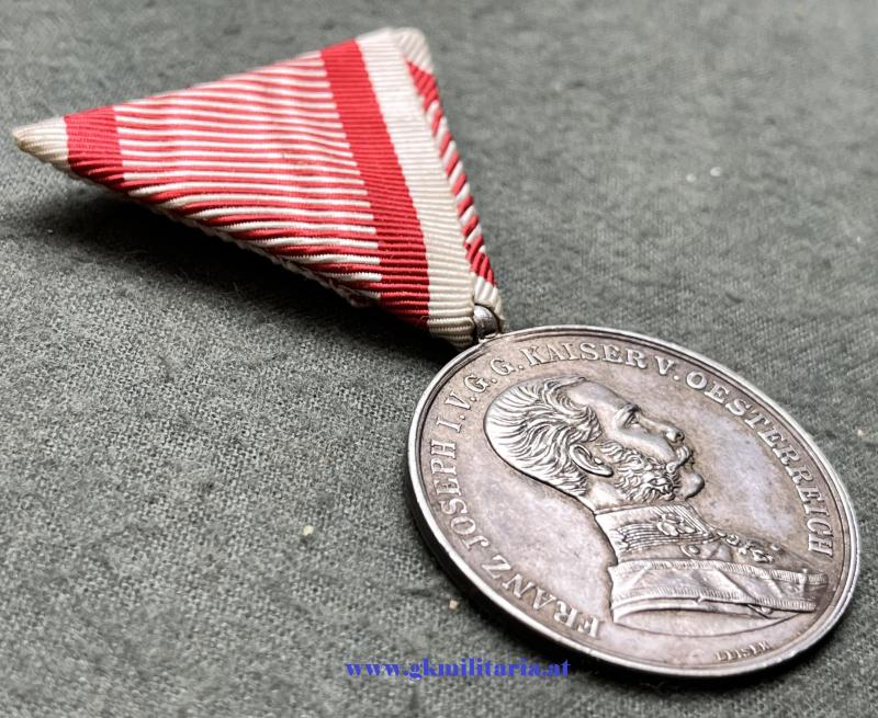 k.u.k. Tapferkeitsmedaille Silber 1. Klasse Kaiser Franz Josef I. - Silber "A" Punze für HMA Wien - Stempelschneider Leisek - am originalem Band - sehr guter Zustand!