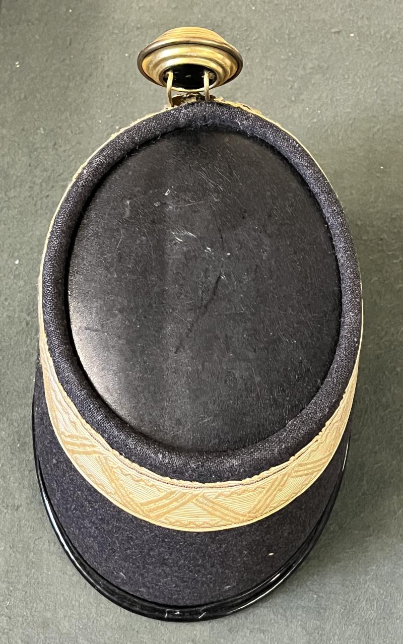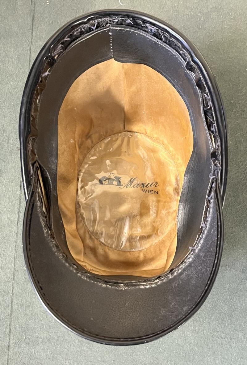 k.u.k. Tschako - Infanterie - Neue Fertigung für Traditionsvereine! - Fertigung der Fa. Mazur Wien - mit Kokarde und Doppeladler - Schweißband hat sich gelöst - Lackfärbiges Band aussen nachgenäht - gebrauchter Zustand!