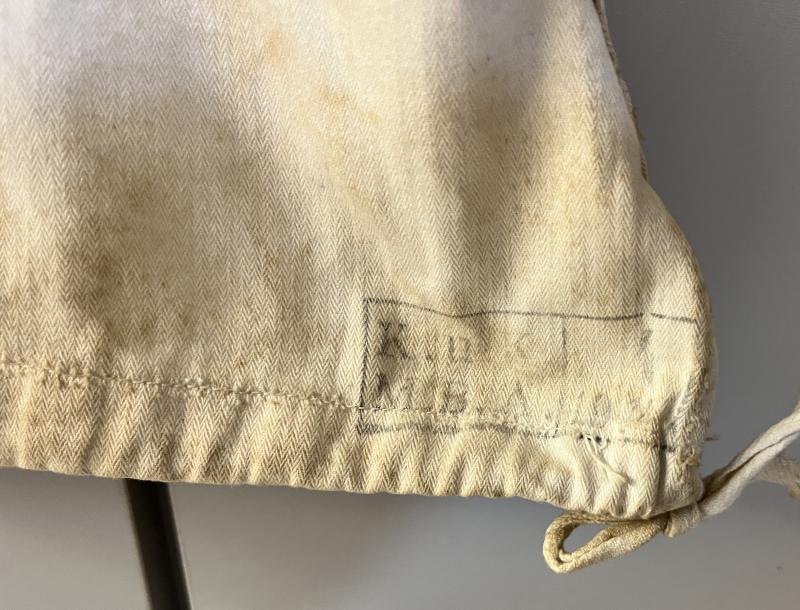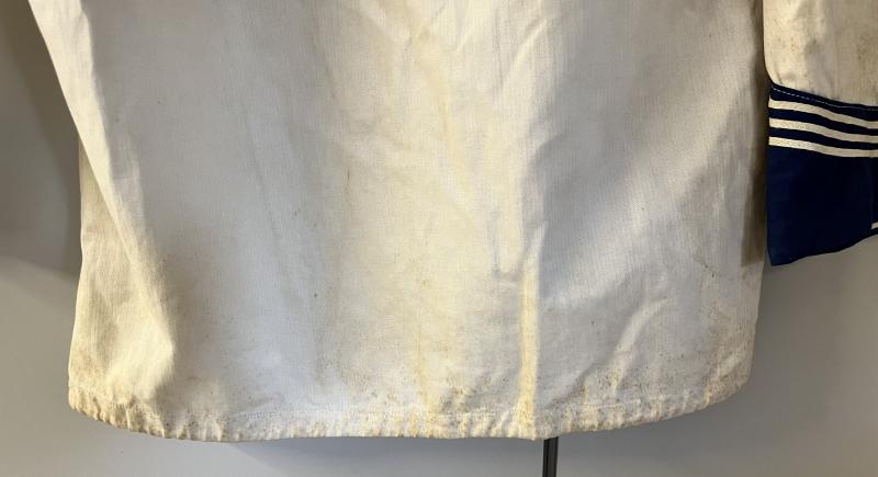 nach der org. Vorschr. 1911, III. Hauptstück, gefertigt aus weißem Leinenstoff (verschmutzt und auf der Brust blaue Verfärbung) - an der Halsöffnung der "Kieler Kragen" der Vorschrift nach - , Zugband am Unterrand vorhanden aber verschloffen - dort gestempelt 'k. u. k. MBA 1914', kein Spezialitätenabzeichen, - an den Unterärmeln je eine angenähte Manschette - schon sehr selten gewordene Bekleidungssorte der k. u. k. Kriegsmarine im gebrauchtem ungereinigten teilweise verschmutztem Fundzustand! (Durch professionelle Reinigung stark zu verbessern!)