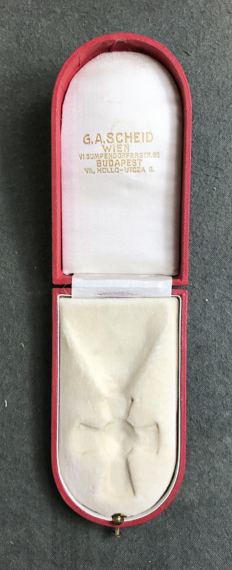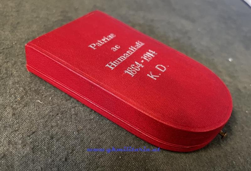 k.u.k. Etui - Ehrenzeichen Rotes Kreuz 2. Klasse mit KD - TOP! - innen mit Hersteller SCHEID, Wien u. Budapest - auf Deckel silberner Aufdruck "Patriae ac Humanitati 1864-1914 - K.D." - TOP-Zustand!
